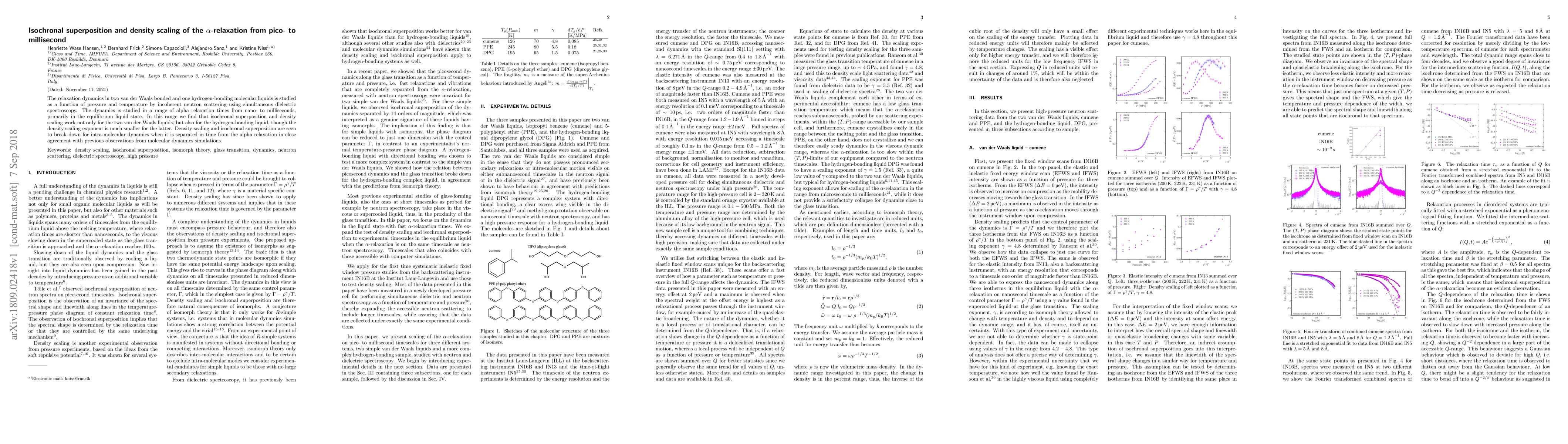 The relaxation dynamics in two van der Waals bonded and one hydrogen-bonding molecular liquids is studied as a function of pressure and temperature by incoherent neutron scattering using simultaneous dielectric spectroscopy. The dynamics is studied in a range of alpha relaxation times from nano- to milliseconds, primarily in the equilibrium liquid state. In this range we find that isochronal superposition and density scaling work not only for the two van der Waals liquids, but also for the hydrogen-bonding liquid, though the density scaling exponent is much smaller for the latter. Density scaling and isochronal superposition are seen to break down for intra-molecular dynamics when it is separated in time from the $\alpha$-relaxation in close agreement with previous observations from molecular dynamics simulations.