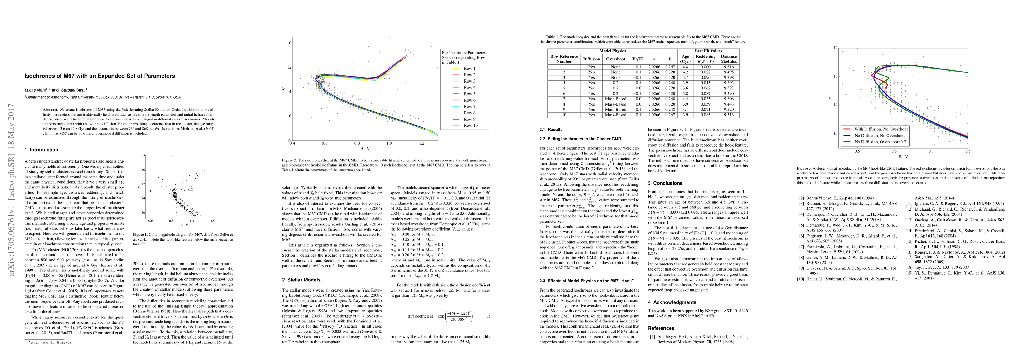 This paper develops isochrones for the M67 cluster using the Yale Rotating Stellar Evolution Code, varying parameters like metallicity, mixing length, and initial helium abundance. The age range derived from fitting the isochrones to the cluster is 3.6 to 4.8 Gyr, with a distance range of 755 to 868 pc. It confirms that M67 can be fit without convective overshoot if diffusion is included.