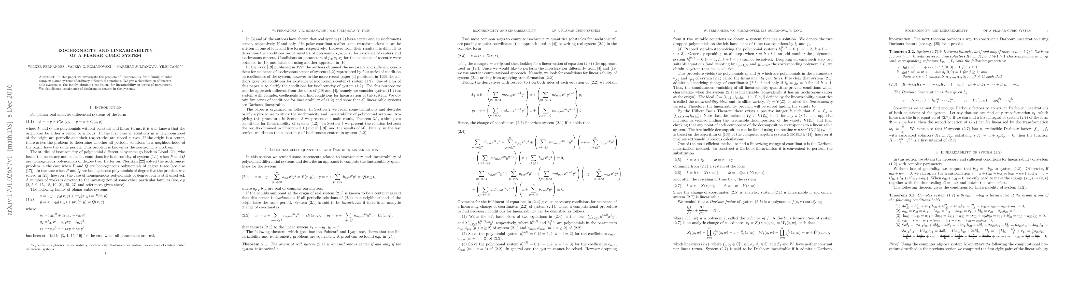 In this paper we investigate the problem of linearizability for a family of cubic complex planar systems of ordinary differential equations. We give a classification of linearizable systems in the family obtaining conditions for linearizability in terms of parameters. We also discuss coexistence of isochronous centers in the systems.