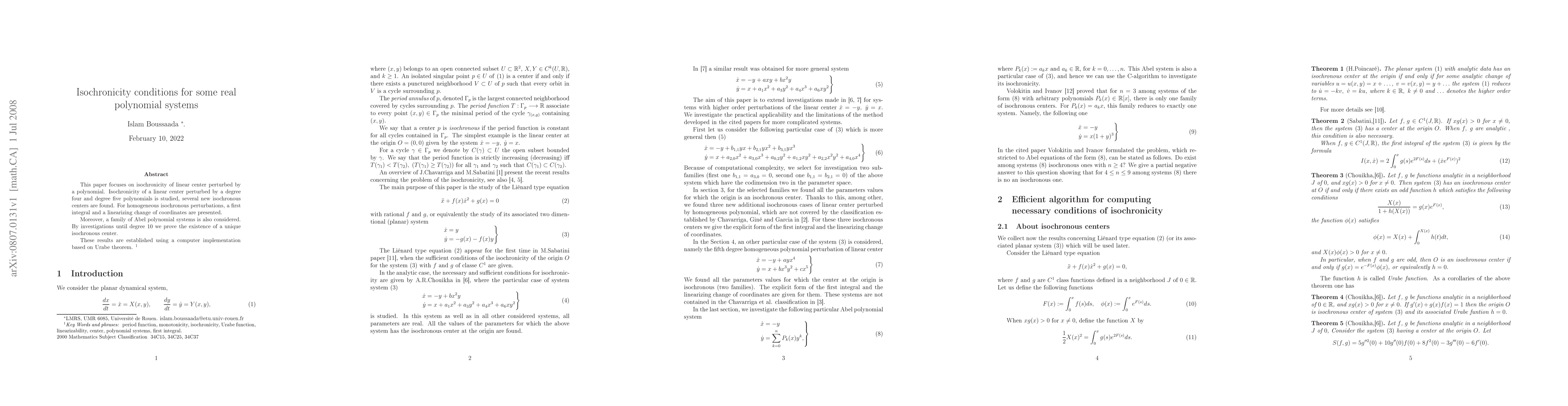 This paper focuses on isochronicity of linear center perturbed by a polynomial. Isochronicity of a linear center perturbed by a degree four and degree five polynomials is studied, several new isochronous centers are found. For homogeneous isochronous perturbations, a first integral and a linearizing change of coordinates are presented. Moreover, a family of Abel polynomial systems is also considered. By investigations until degree 10 we prove the existence of a unique isochronous center. These results are established using a computer implementation based on Urabe theorem.