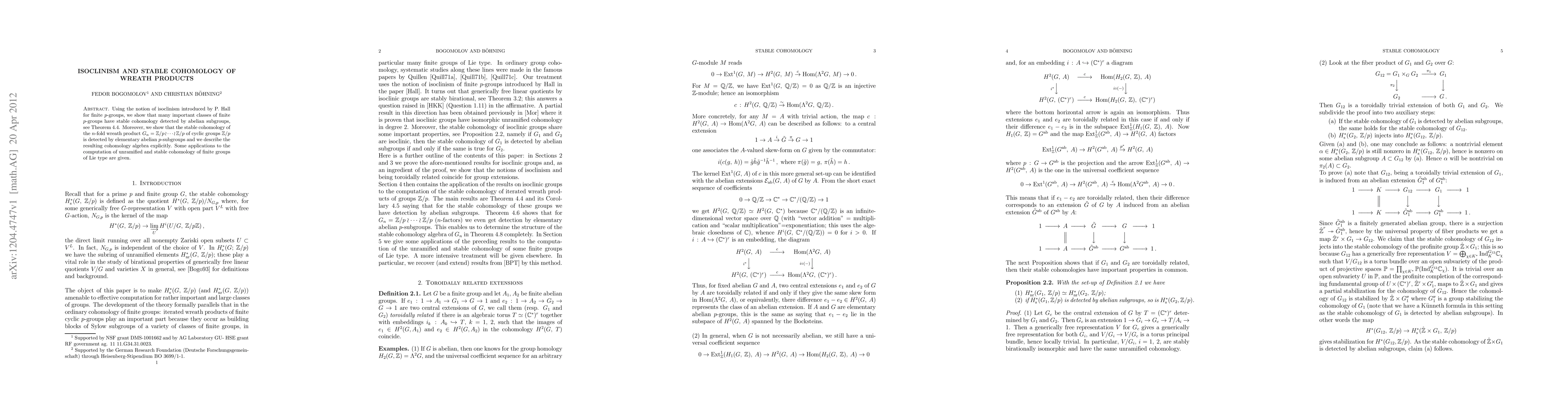 This paper explores the isoclinism of finite p-groups, demonstrating that many classes have stable cohomology detectable by abelian subgroups. It specifically investigates the cohomology of n-fold wreath products of cyclic groups, showing it is detectable by elementary abelian p-subgroups and describing the resulting cohomology algebra. Applications to unramified and stable cohomology of finite groups of Lie type are also discussed.