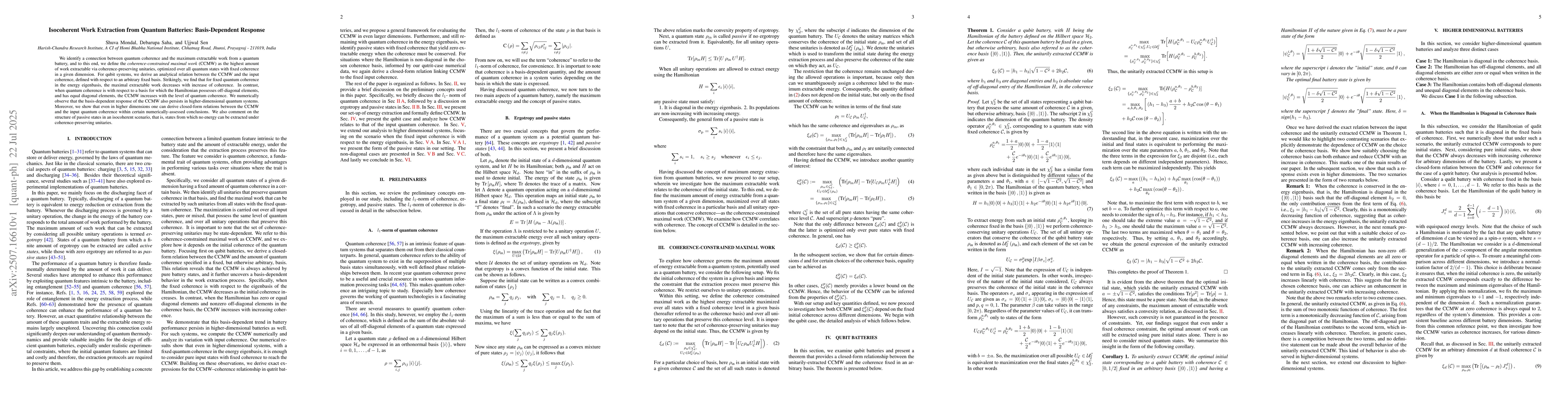We identify a connection between quantum coherence and the maximum extractable work from a quantum battery, and to this end, we define the coherence-constrained maximal work (CCMW) as the highest amount of work extractable via coherence-preserving unitaries, optimized over all quantum states with fixed coherence in a given dimension. For qubit systems, we derive an analytical relation between the CCMW and the input coherence, defined with respect to an arbitrary fixed basis. Strikingly, we find that for fixed quantum coherence in the energy eigenbasis, the maximal extractable work decreases with increase of coherence. In contrast, when quantum coherence is with respect to a basis for which the Hamiltonian possesses off-diagonal elements, and has equal diagonal elements, the CCMW increases with the level of quantum coherence. We numerically observe that the basis-dependent response of the CCMW also persists in higher-dimensional quantum systems. Moreover, we show that even in higher dimensions one can derive closed-form relations between the CCMW and the input quantum coherence within certain numerically-assessed conclusions. We also comment on the structure of passive states in an isocoherent scenario, that is, states from which no energy can be extracted under coherence-preserving unitaries.