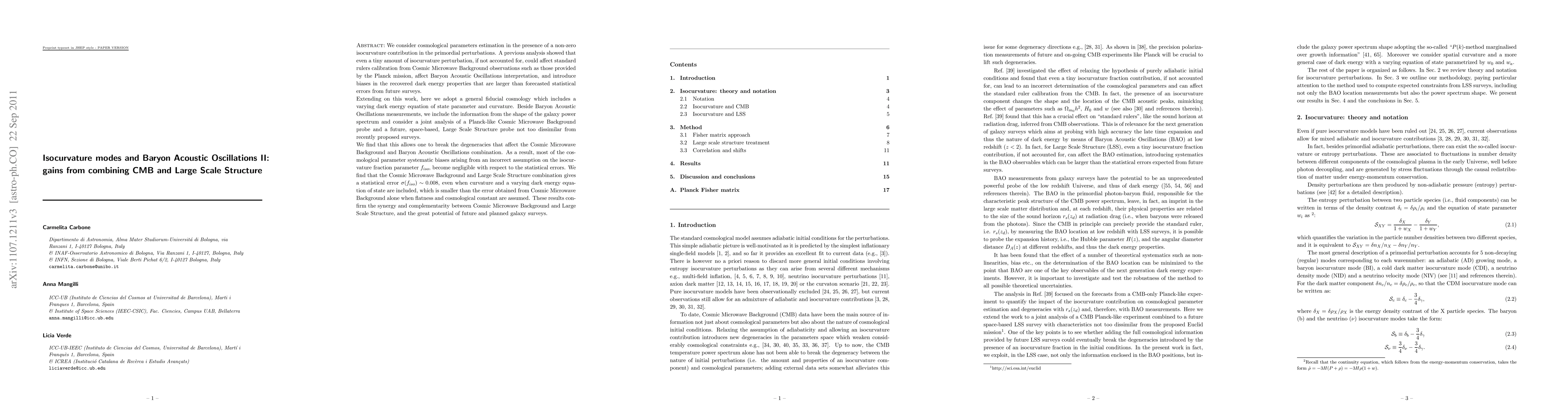 We consider cosmological parameters estimation in the presence of a non-zero isocurvature contribution in the primordial perturbations. A previous analysis showed that even a tiny amount of isocurvature perturbation, if not accounted for, could affect standard rulers calibration from Cosmic Microwave Background observations such as those provided by the Planck mission, affect Baryon Acoustic Oscillations interpretation and introduce biases in the recovered dark energy properties that are larger than forecasted statistical errors from future surveys. Extending on this work, here we adopt a general fiducial cosmology which includes a varying dark energy equation of state parameter and curvature. Beside Baryon Acoustic Oscillations measurements, we include the information from the shape of the galaxy power spectrum and consider a joint analysis of a Planck-like Cosmic Microwave Background probe and a future, space-based, Large Scale Structure probe not too dissimilar from recently proposed surveys. We find that this allows one to break the degeneracies that affect the Cosmic Microwave Background and Baryon Acoustic Oscillations combination. As a result, most of the cosmological parameter systematic biases arising from an incorrect assumption on the isocurvature fraction parameter $f_{iso}$, become negligible with respect to the statistical errors. We find that the Cosmic Microwave Background and Large Scale Structure combination gives a statistical error $\sigma(f_{iso}) \sim 0.008$, even when curvature and a varying dark energy equation of state are included, which is smaller than the error obtained from Cosmic Microwave Background alone when flatness and cosmological constant are assumed. These results confirm the synergy and complementarity between Cosmic Microwave Background and Large Scale Structure, and the great potential of future and planned galaxy surveys.
