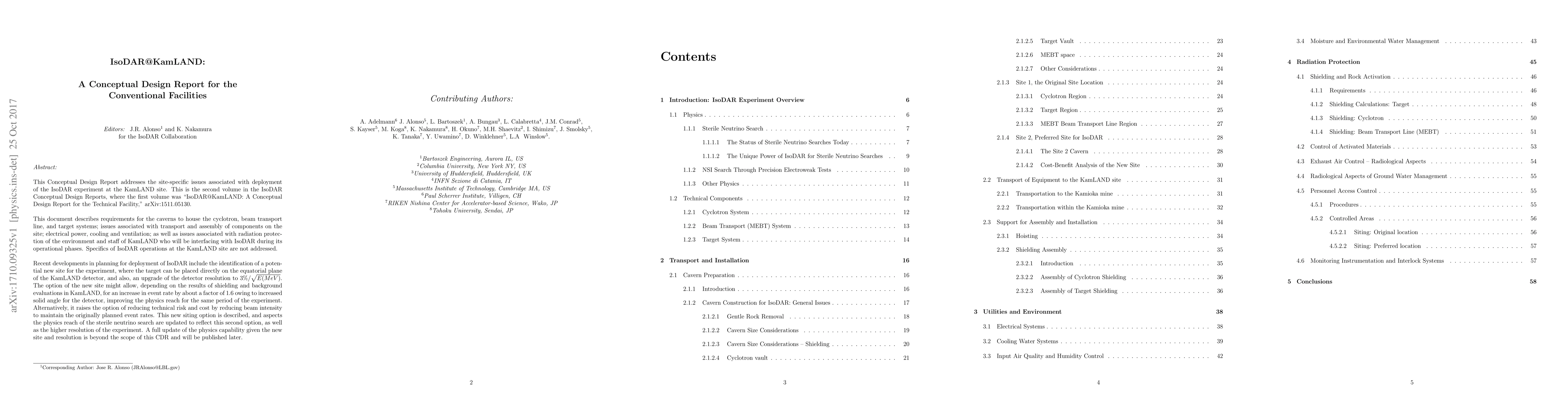 This report outlines the design and operational requirements for IsoDAR at the KamLAND facility, including caverns for the cyclotron, beam transport, and target systems, and addresses site integration, power, cooling, ventilation, and radiation protection. It also explores a new site option that could enhance the detector's solid angle and event rate, potentially improving the sterile neutrino search, while also considering reduced beam intensity to maintain original event rates.