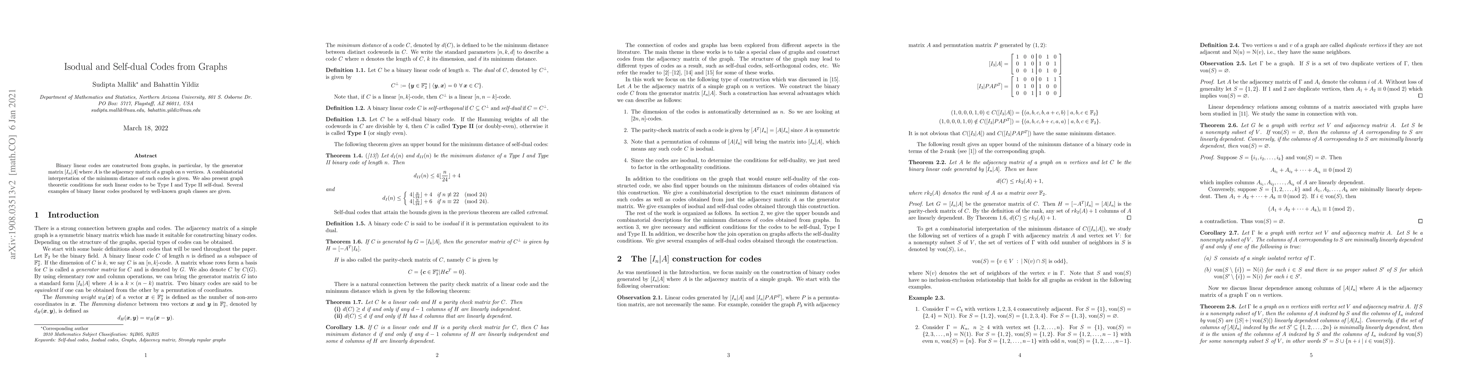 The paper introduces a method for constructing binary linear codes from graphs and provides conditions for self-duality, contributing to the intersection of graph theory and coding theory.