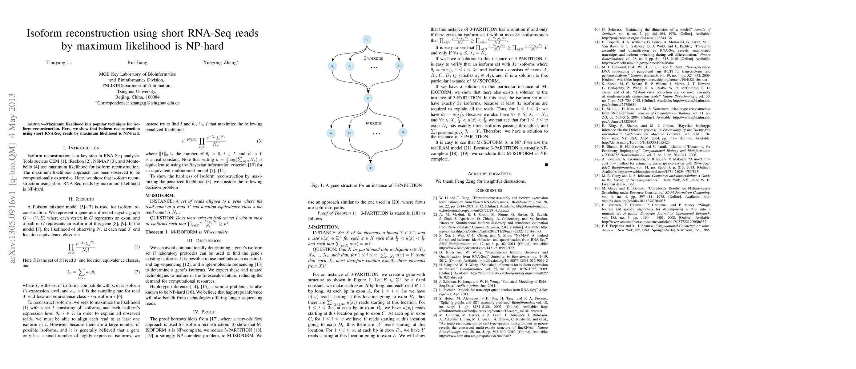 The paper establishes the NP-completeness of isoform reconstruction using maximum likelihood with short RNA-Seq reads, introducing a decision problem M-ISOFORM and proving its NP-completeness via reduction from the 3-PARTITION problem.