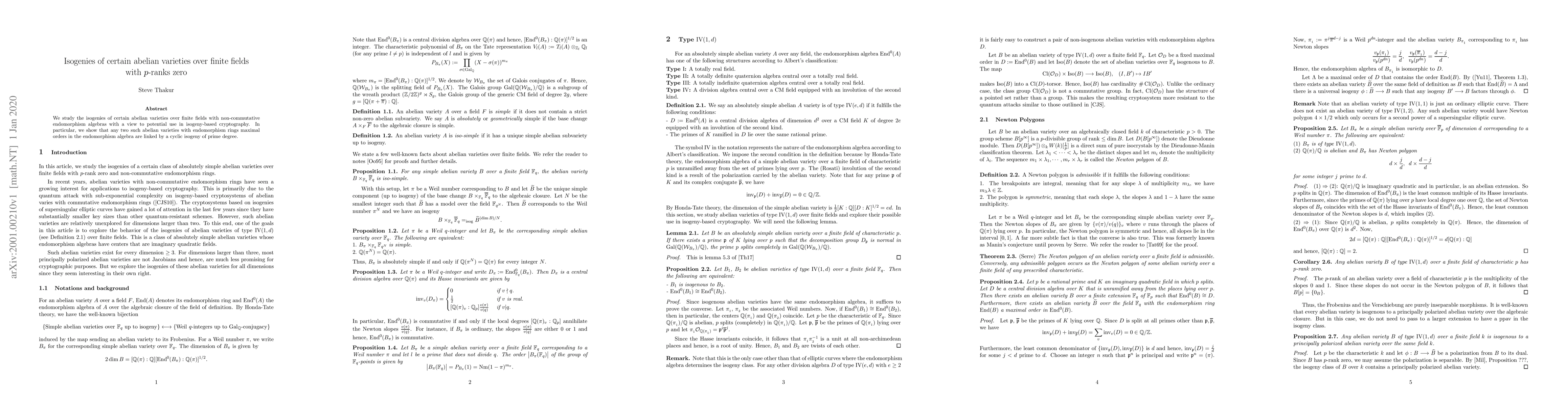 Summary: The paper investigates isogenies between specific abelian varieties over finite fields with non-commutative endomorphism algebras, revealing that any two such varieties with maximal endomorphism rings are connected by a cyclic isogeny of prime degree, relevant for isogeny-based cryptographic applications.