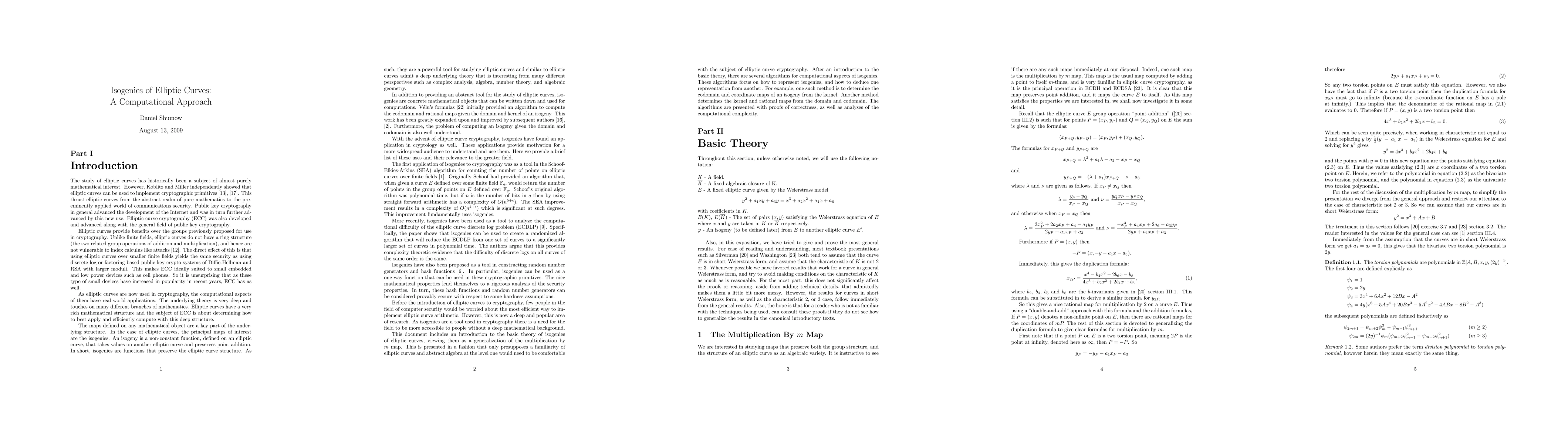 This paper introduces isogenies of elliptic curves, essential for cryptology, and presents computational algorithms for computing them, emphasizing algebraic proofs for clarity and efficiency in the context of elliptic curve cryptography.