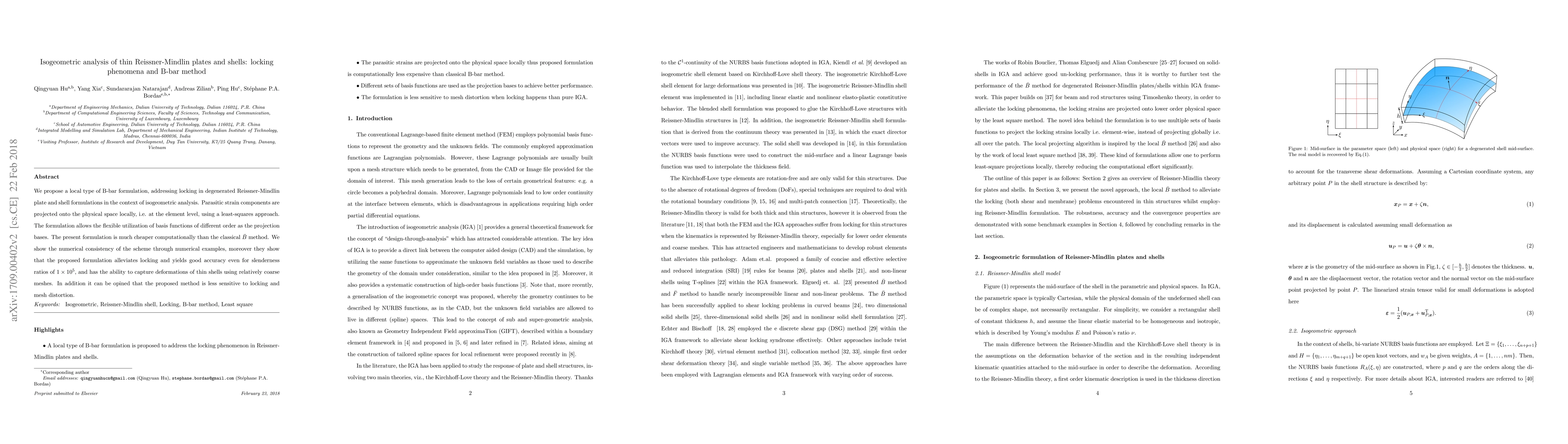 This paper proposes a local B-bar formulation to address locking phenomena in thin Reissner-Mindlin plates and shells within isogeometric analysis. The method projects parasitic strain components locally using a least-squares approach, allowing for cost-effective computations and accurate deformation capture even with coarse meshes.