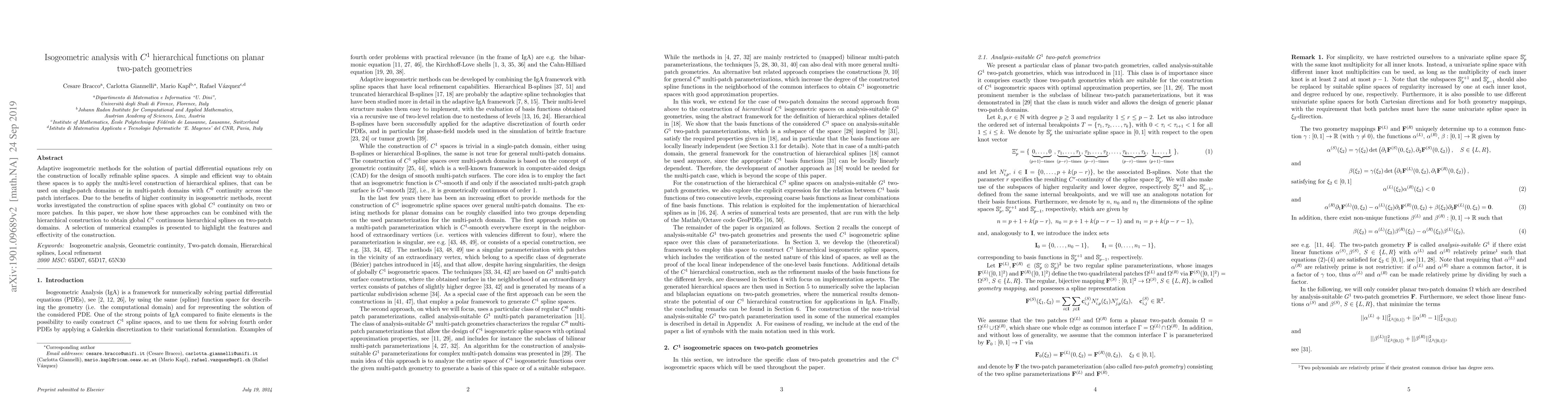 This paper explores adaptive isogeometric analysis using hierarchical splines with global $C^1$ continuity on two-patch planar geometries. It combines hierarchical construction methods with $C^1$ spline spaces to enhance continuity and presents numerical examples to demonstrate the effectiveness of the approach.