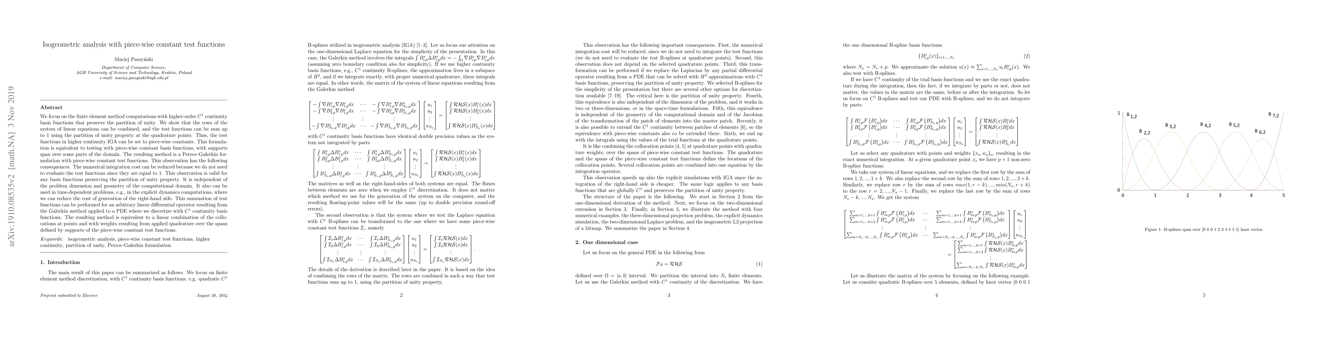 We focus on the finite element method computations with higher-order C1 continuity basis functions that preserve the partition of unity. We show that the rows of the system of linear equations can be combined, and the test functions can be sum up to 1 using the partition of unity property at the quadrature points. Thus, the test functions in higher continuity IGA can be set to piece-wise constants. This formulation is equivalent to testing with piece-wise constant basis functions, with supports span over some parts of the domain. The resulting method is a Petrov-Galerkin formulation with piece-wise constant test functions. This observation has the following consequences. The numerical integration cost can be reduced because we do not need to evaluate the test functions since they are equal to 1. This observation is valid for any basis functions preserving the partition of unity property. It is independent of the problem dimension and geometry of the computational domain. It also can be used in time-dependent problems, e.g., in the explicit dynamics computations, where we can reduce the cost of generation of the right-hand side. This summation of test functions can be performed for an arbitrary linear differential operator resulting from the Galerkin method applied to a PDE where we discretize with C1 continuity basis functions. The resulting method is equivalent to a linear combination of the collocations at points and with weights resulting from applied quadrature over the spans defined by supports of the piece-wise constant test functions.