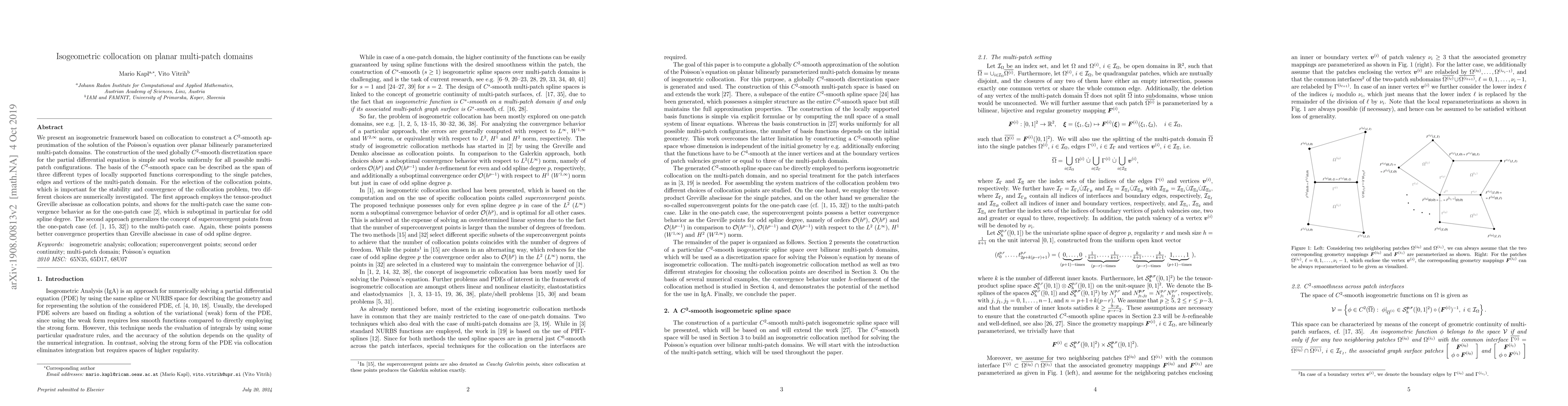 This paper introduces an isogeometric collocation method for solving the Poisson's equation on planar multi-patch domains, ensuring $C^2$-smooth continuity. It proposes a simple globally $C^2$-smooth discretization space and investigates two collocation point selection strategies for stability and convergence.