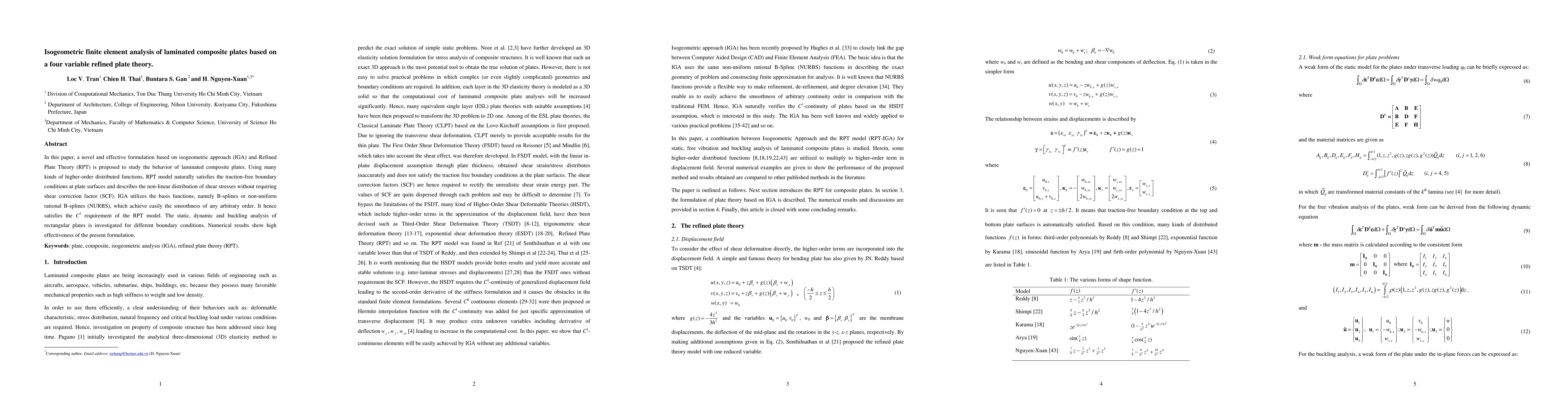 In this paper, a novel and effective formulation based on isogeometric approach (IGA) and Refined Plate Theory (RPT) is proposed to study the behavior of laminated composite plates. Using many kinds of higher-order distributed functions, RPT model naturally satisfies the traction-free boundary conditions at plate surfaces and describes the non-linear distribution of shear stresses without requiring shear correction factor (SCF). IGA utilizes the basis functions, namely B-splines or non-uniform rational B-splines (NURBS), which achieve easily the smoothness of any arbitrary order. It hence satisfies the C1 requirement of the RPT model. The static, dynamic and buckling analysis of rectangular plates is investigated for different boundary conditions. Numerical results show high effectiveness of the present formulation.