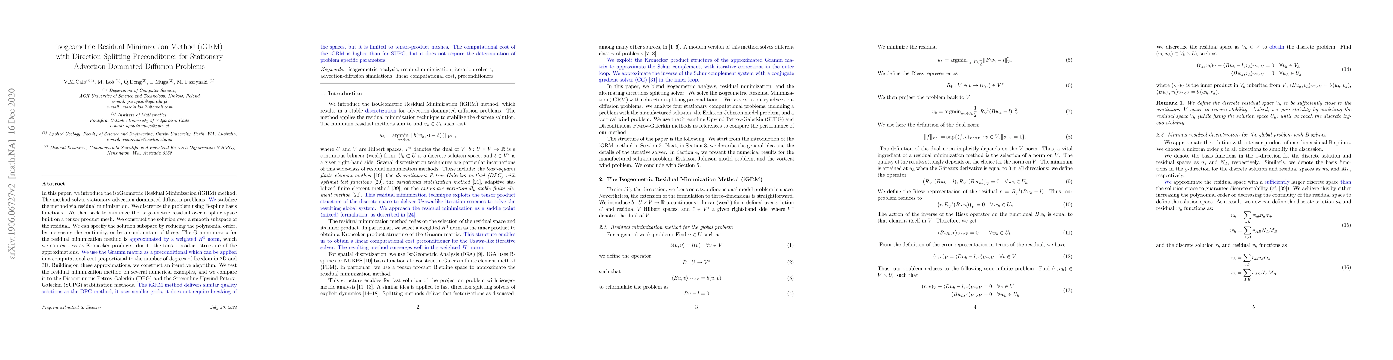 This paper introduces the isoGeometric Residual Minimization (iGRM) method for solving stationary advection-diffusion problems using B-spline basis functions. It employs a direction splitting preconditioner and demonstrates comparable solution quality to the DPG method while requiring fewer grids and no space breaking.