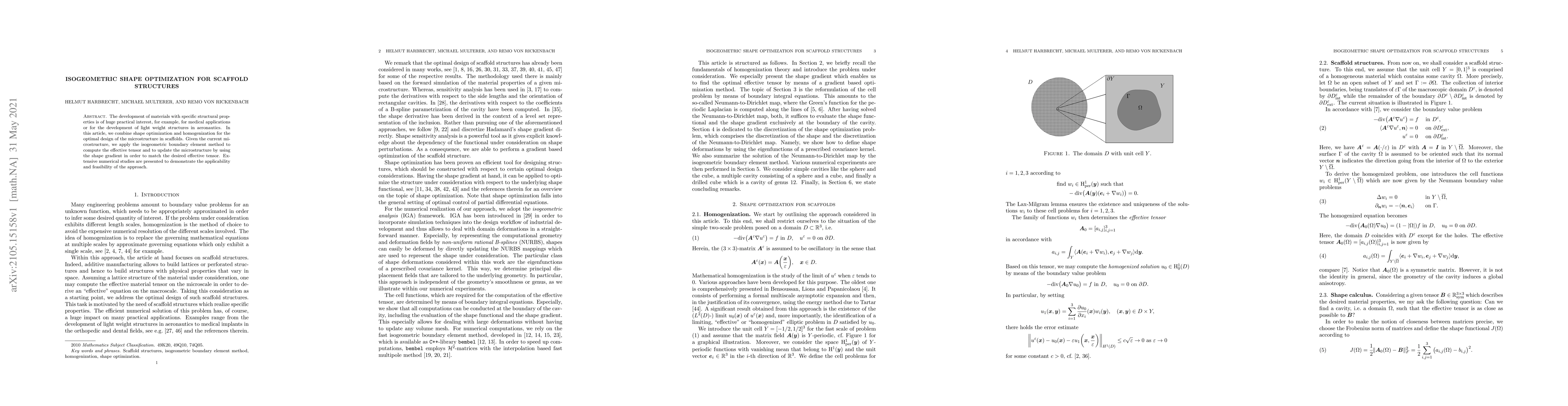 The development of materials with specific structural properties is of huge practical interest, for example, for medical applications or for the development of light weight structures in aeronautics. In this article, we combine shape optimization and homogenization for the optimal design of the microstructure in scaffolds. Given the current microstructure, we apply the isogeometric boundary element method to compute the effective tensor and to update the microstructure by using the shape gradient in order to match the desired effective tensor. Extensive numerical studies are presented to demonstrate the applicability and feasibility of the approach.