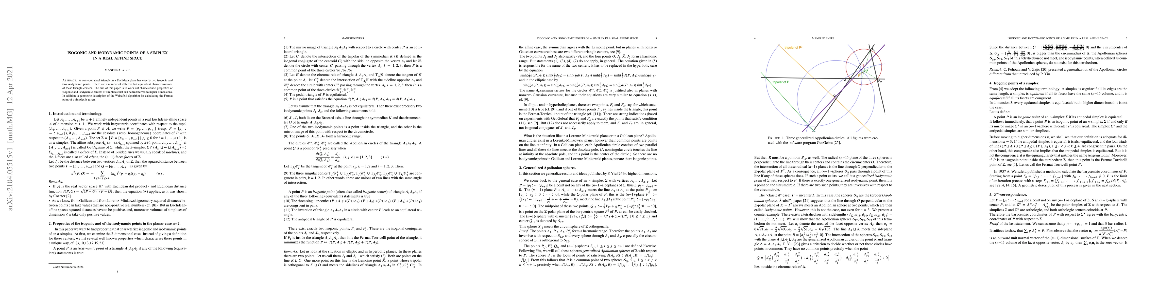 A non-equilateral triangle in a Euclidean plane has exactly two isogonic and two isodynamic points. There are a number of different but equivalent characterizations of these triangle centers. The aim of this paper is to work out characteristic properties of isogonic and isodynamic centers of simplices that can be transferred to higher dimensions. In addition, a geometric description of the Weiszfeld algorithm for calculating the Fermat point of a simplex is given.