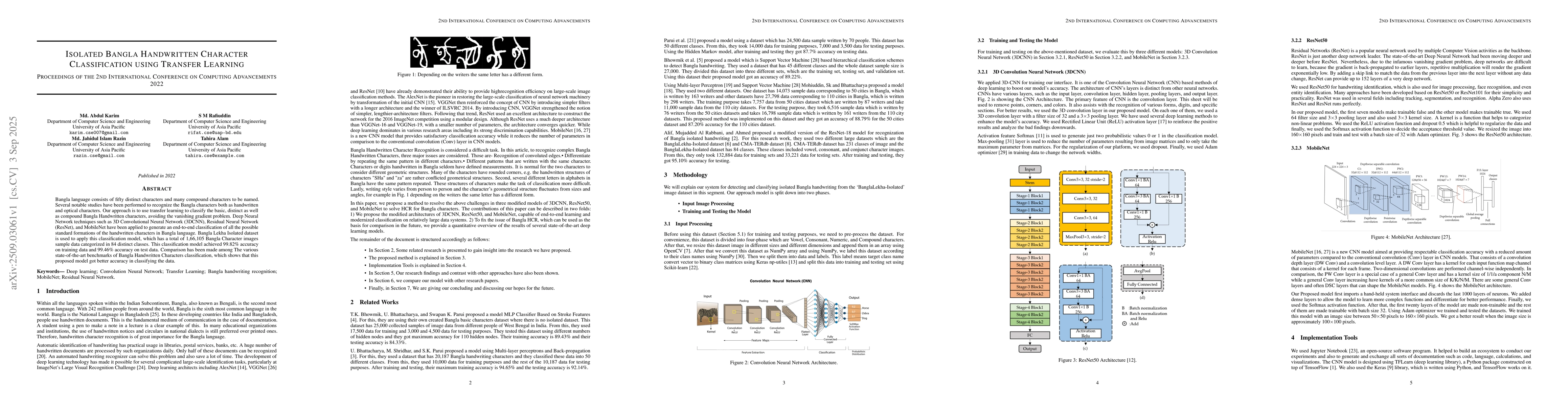Bangla language consists of fifty distinct characters and many compound characters. Several notable studies have been performed to recognize Bangla characters, both handwritten and optical. Our approach uses transfer learning to classify the basic, distinct, as well as compound Bangla handwritten characters while avoiding the vanishing gradient problem. Deep Neural Network techniques such as 3D Convolutional Neural Network (3DCNN), Residual Neural Network (ResNet), and MobileNet are applied to generate an end-to-end classification of all possible standard formations of handwritten characters in the Bangla language. The Bangla Lekha Isolated dataset, which contains 166,105 Bangla character image samples categorized into 84 distinct classes, is used for this classification model. The model achieved 99.82% accuracy on training data and 99.46% accuracy on test data. Comparisons with various state-of-the-art benchmarks of Bangla handwritten character classification show that the proposed model achieves better accuracy in classifying the data.