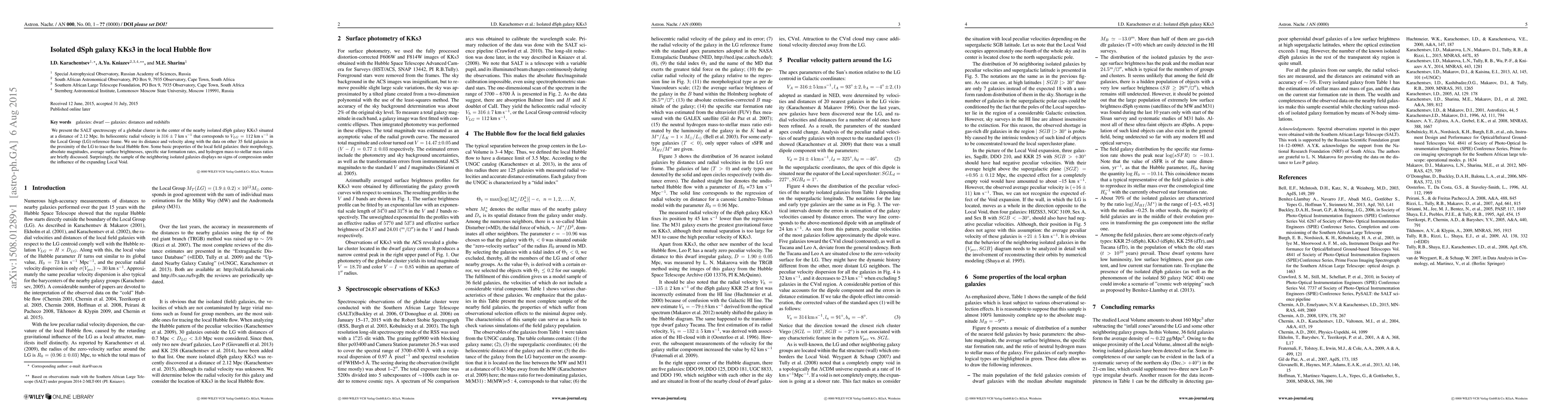 We present the SALT spectroscopy of a globular cluster in the center of the nearby isolated dSph galaxy KKs3 situated at a distance of 2.12 Mpc. Its heliocentric radial velocity is 316+-7 km/s that corresponds to V_{LG} = 112 km/s in the Local Group (LG) reference frame. We use its distance and velocity along with the data on other 35 field galaxies in the proximity of the LG to trace the local Hubble flow. Some basic properties of the local field galaxies: their morphology, absolute magnitudes, average surface brightnesses, specific star formation rates, and hydrogen mass-to-stellar mass ratios are briefly discussed. Surprisingly, the sample of the neighboring isolated galaxies displays no signs of compression under the influence of the expanding Local Void.