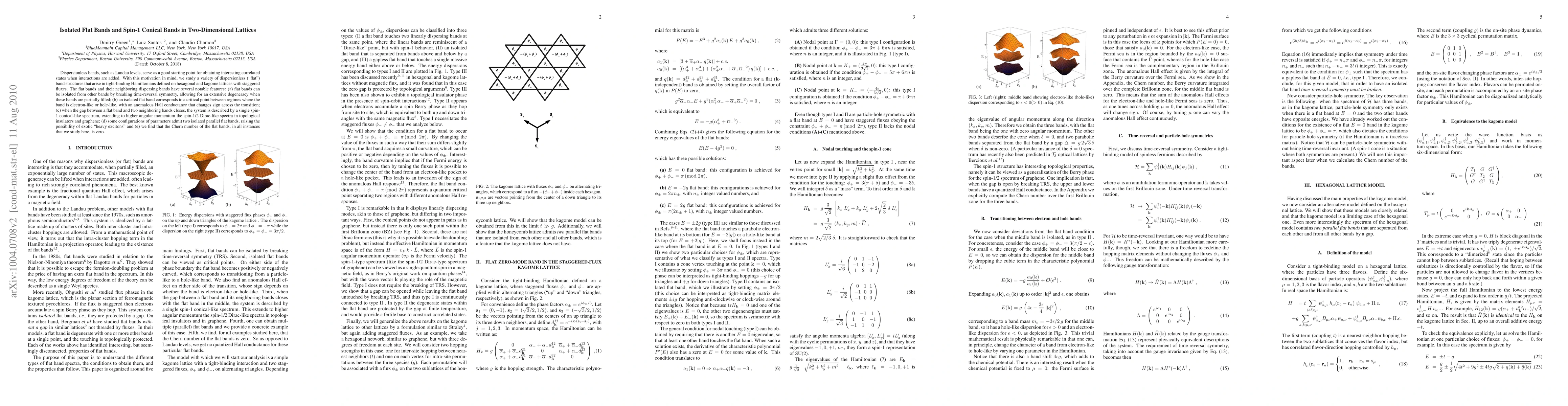 Dispersionless bands, such as Landau levels, serve as a good starting point for obtaining interesting correlated states when interactions are added. With this motivation in mind, we study a variety of dispersionless ("flat") band structures that arise in tight-binding Hamiltonians defined on hexagonal and kagome lattices with staggered fluxes. The flat bands and their neighboring dispersing bands have several notable features: (a) Flat bands can be isolated from other bands by breaking time reversal symmetry, allowing for an extensive degeneracy when these bands are partially filled; (b) An isolated flat band corresponds to a critical point between regimes where the band is electron-like or hole-like, with an anomalous Hall conductance that changes sign across the transition; (c) When the gap between a flat band and two neighboring bands closes, the system is described by a single spin-1 conical-like spectrum, extending to higher angular momentum the spin-1/2 Dirac-like spectra in topological insulators and graphene; and (d) some configurations of parameters admit two isolated parallel flat bands, raising the possibility of exotic "heavy excitons"; (e) We find that the Chern number of the flat bands, in all instances that we study here, is zero.
