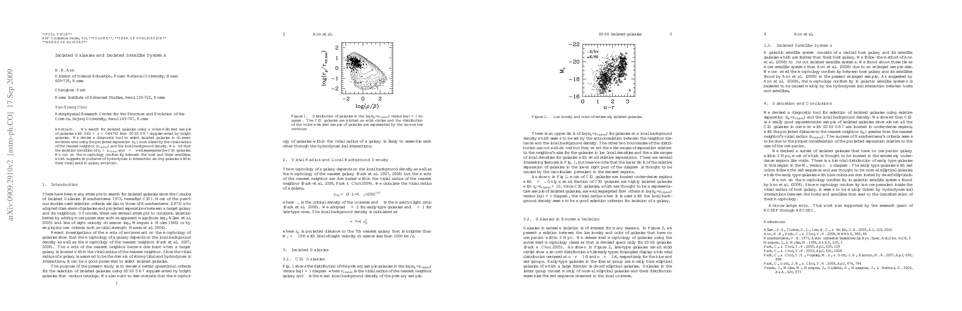 We search for isolated galaxies using a volume-limited sample of galaxies with 0.02< z < 0.04742 from SDSS DR7 supplemented by bright galaxies. We devise a diagnostic tool to select isolated galaxies in different environments using the projected separation (r_p) normalized by the virial radius of the nearest neighbor (r_{vir,nei}) and the local background density. We find that the isolation condition of r_p>r_{vir,nei} and \rho <\bar{\rho} well segregates the CIG galaxies. We confirm the morphology conformity between the host and their satellites, which suggests importance of hydrodynamic interaction among galaxies within their virial radii in galaxy evolution.