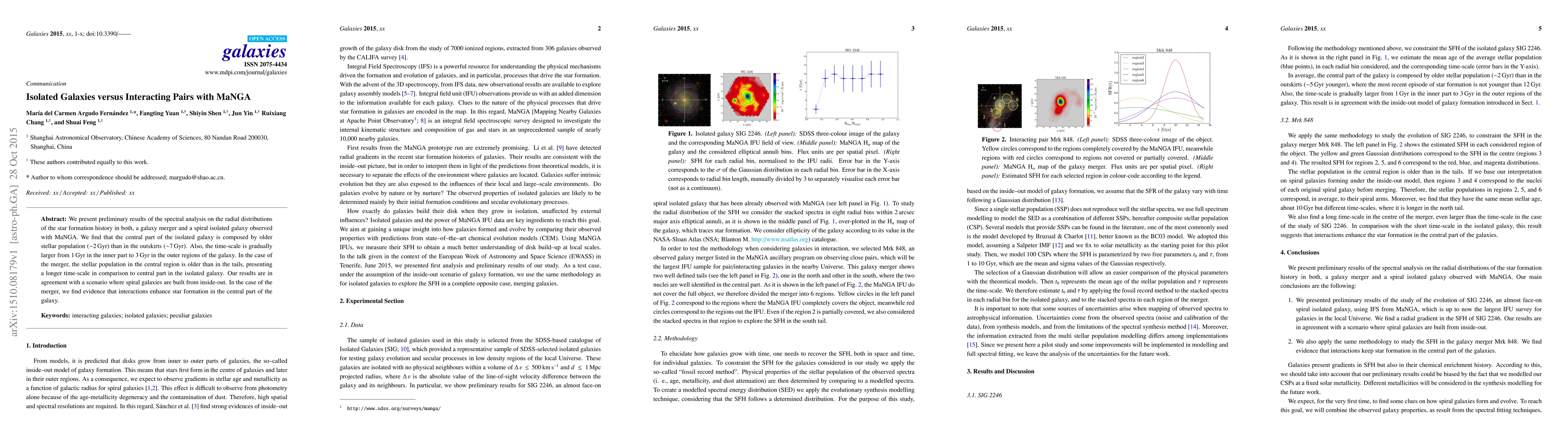 We present preliminary results of the spectral analysis on the radial distributions of the star formation history in both, a galaxy merger and a spiral isolated galaxy observed with MaNGA. We find that the central part of the isolated galaxy is composed by older stellar population ($\sim$2 Gyr) than in the outskirts ($\sim$7 Gyr). Also, the time-scale is gradually larger from 1 Gyr in the inner part to 3 Gyr in the outer regions of the galaxy. In the case of the merger, the stellar population in the central region is older than in the tails, presenting a longer time-scale in comparison to central part in the isolated galaxy. Our results are in agreement with a scenario where spiral galaxies are built from inside-out. In the case of the merger, we find evidence that interactions enhance star formation in the central part of the galaxy.