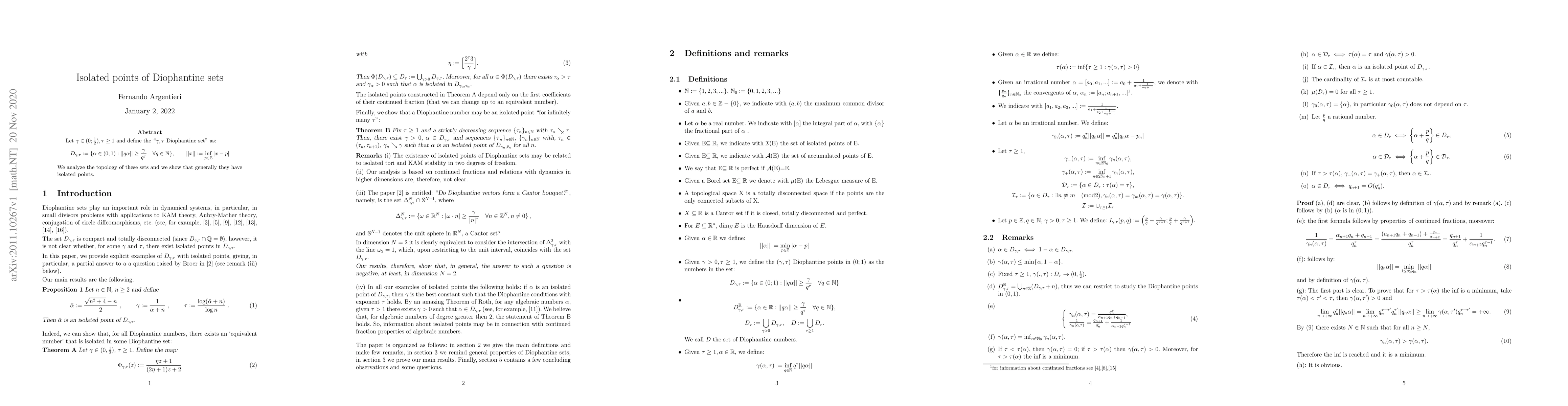 The paper introduces a method to identify isolated points in $\gamma,\tau$ Diophantine sets and proves their existence using continued fraction theory and measure theory.