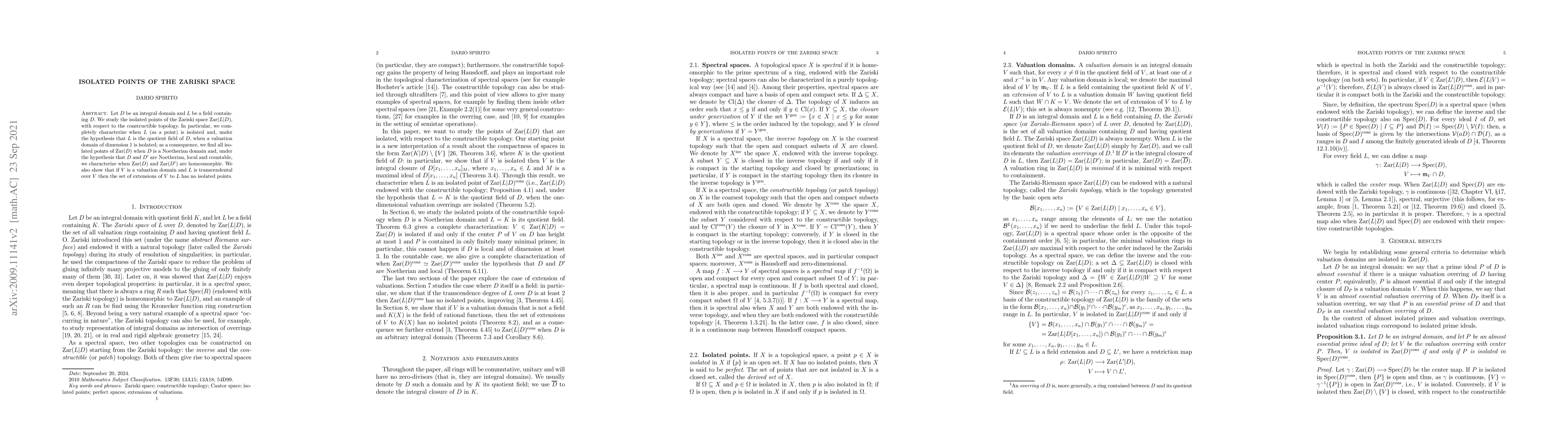 Let $D$ be an integral domain and $L$ be a field containing $D$. We study the isolated points of the Zariski space $\mathrm{Zar}(L|D)$, with respect to the constructible topology. In particular, we completely characterize when $L$ (as a point) is isolated and, under the hypothesis that $L$ is the quotient field of $D$, when a valuation domain of dimension $1$ is isolated; as a consequence, we find all isolated points of $\mathrm{Zar}(D)$ when $D$ is a Noetherian domain. We also show that if $V$ is a valuation domain and $L$ is transcendental over $V$ then the set of extensions of $V$ to $L$ has no isolated points.