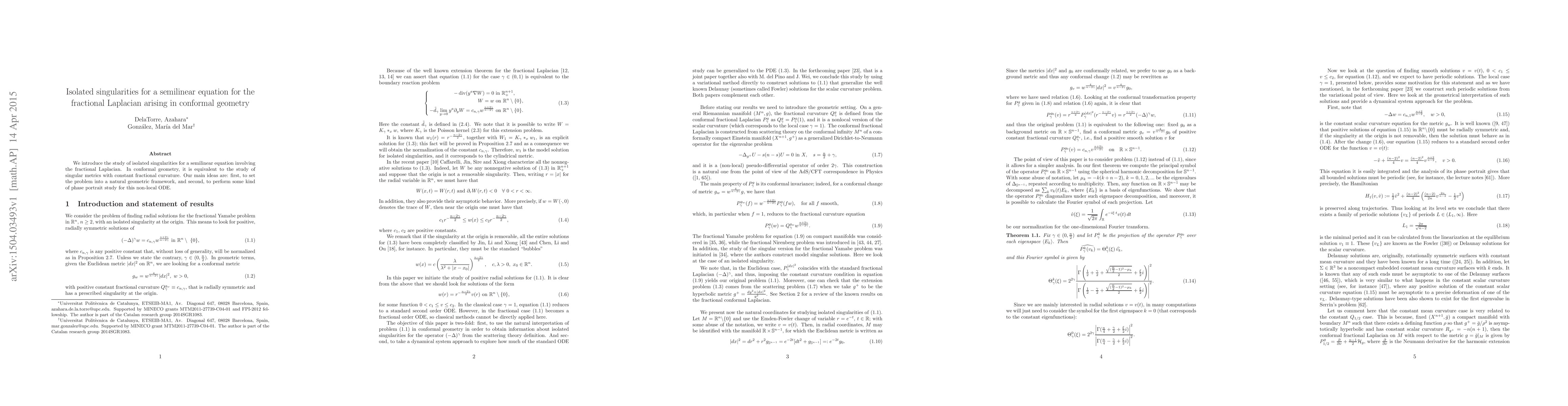 This paper investigates isolated singularities for a semilinear equation involving the fractional Laplacian in conformal geometry, equivalent to studying singular metrics with constant fractional curvature. The authors frame the problem geometrically and conduct a phase portrait analysis for the associated non-local ordinary differential equation.