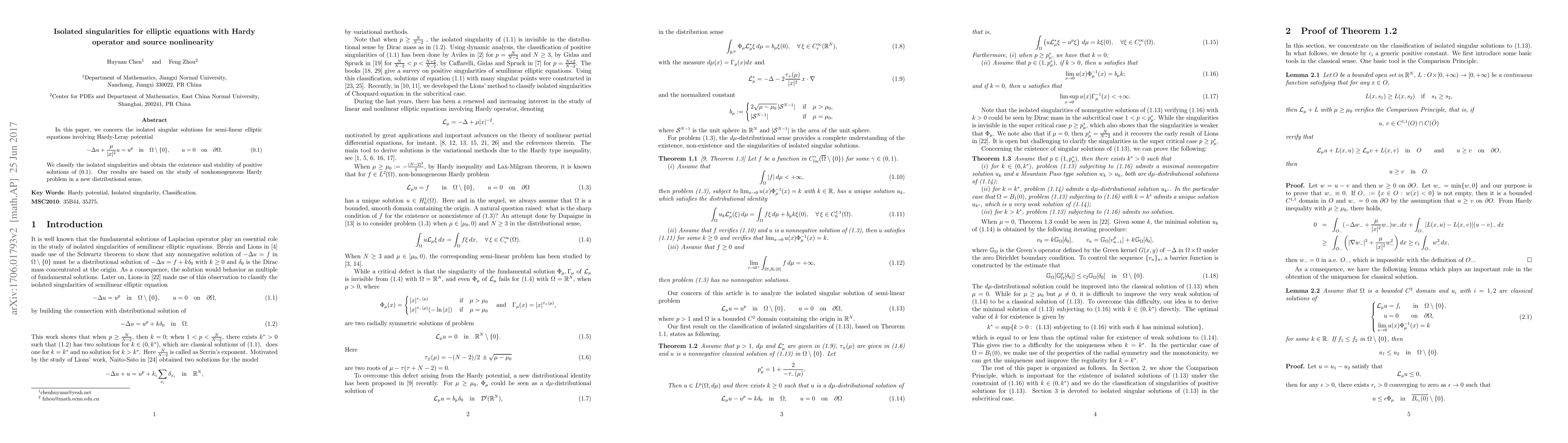 This paper classifies isolated singular solutions for semi-linear elliptic equations with Hardy potentials and source nonlinearity. It establishes the existence and stability of positive solutions based on a new distributional approach to the nonhomogeneous Hardy problem.