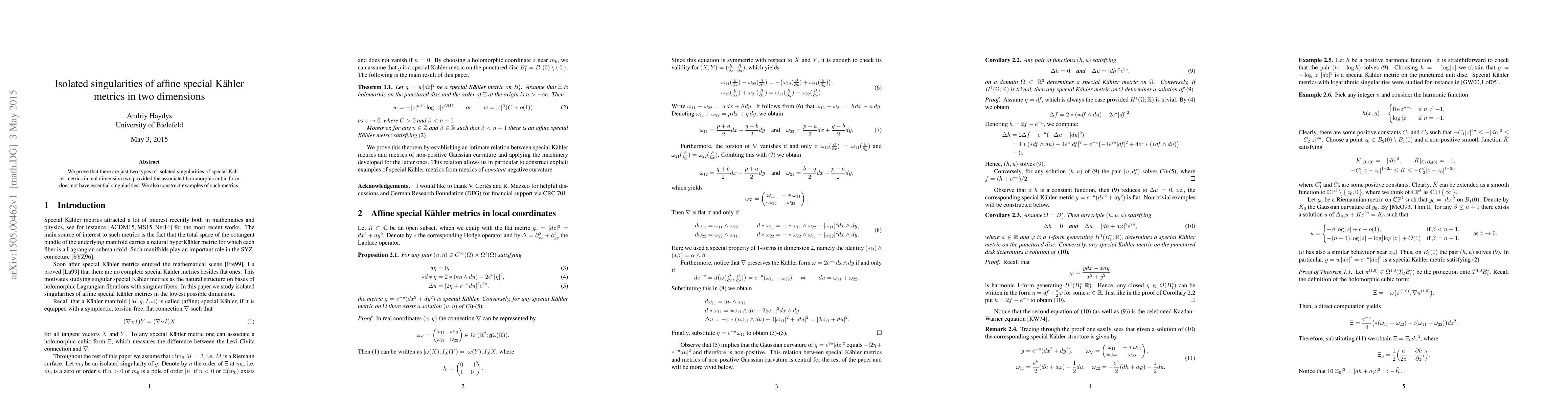 We prove that there are just two types of isolated singularities of special K\"ahler metrics in real dimension two provided the associated holomorphic cubic form does not have essential singularities. We also construct examples of such metrics.