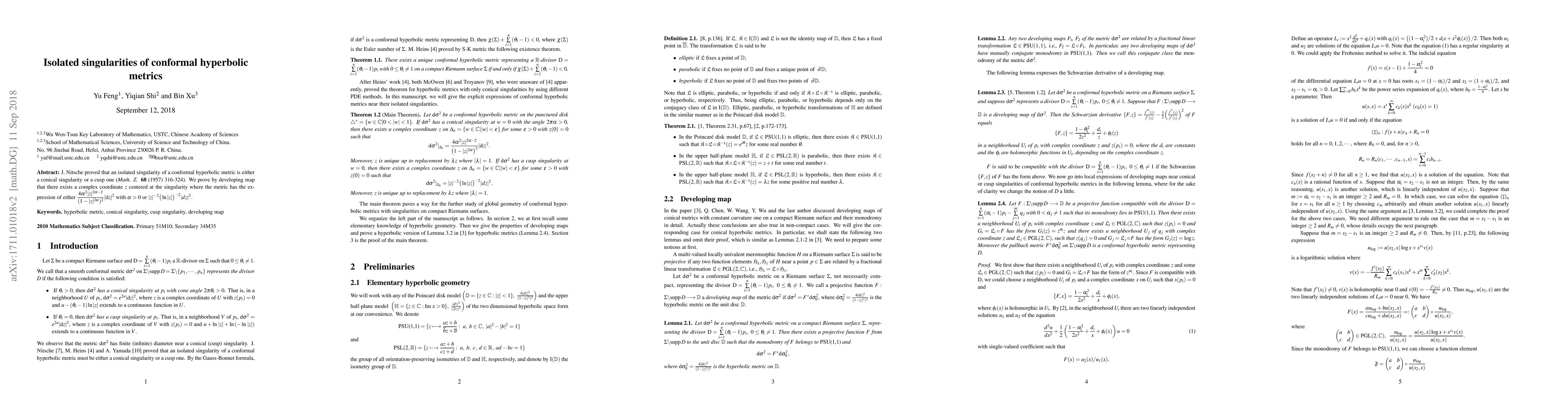 J. Nitsche proved that an isolated singularity of a conformal hyperbolic metric is either a conical singularity or a cusp one. We prove by developing map that there exists a complex coordinate $z$ centered at the singularity where the metric has the expression of either $\displaystyle{\frac{4\alpha^2\vert z \vert^{2\alpha-2}}{(1-\vert z \vert ^{2\alpha})^2}\vert \mathrm{d} z \vert^2}$ with $\alpha>0$ or $\displaystyle{\vert z \vert ^{-2}\big(\ln|z|\big)^{-2}|dz|^{2}}$.