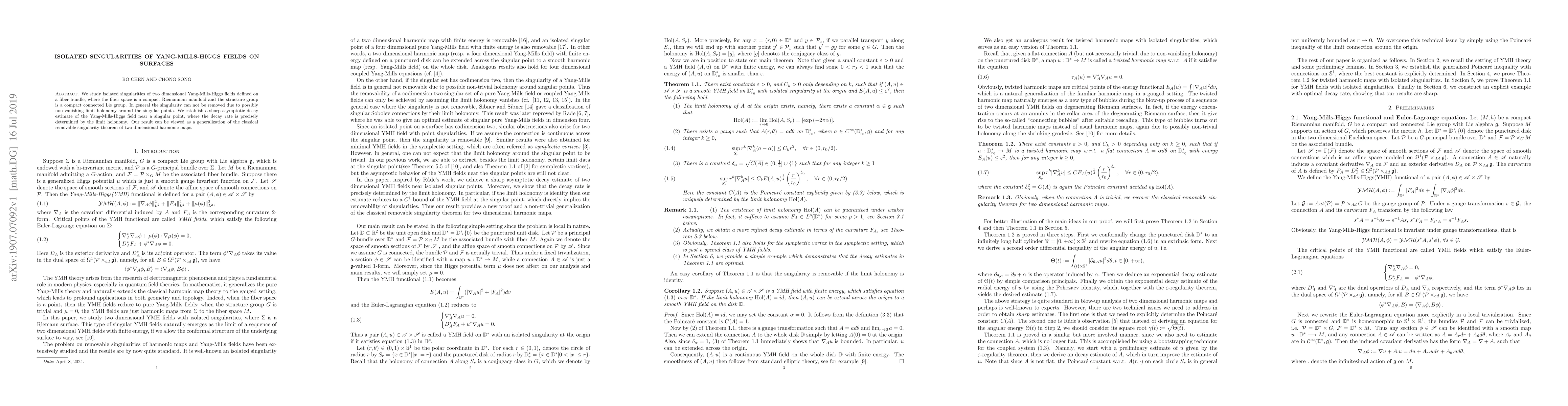 This paper investigates isolated singularities in two-dimensional Yang-Mills-Higgs fields on fiber bundles, establishing a precise asymptotic decay estimate near singular points determined by non-vanishing limit holonomy, and generalizing the classical removable singularity theorem for harmonic maps.