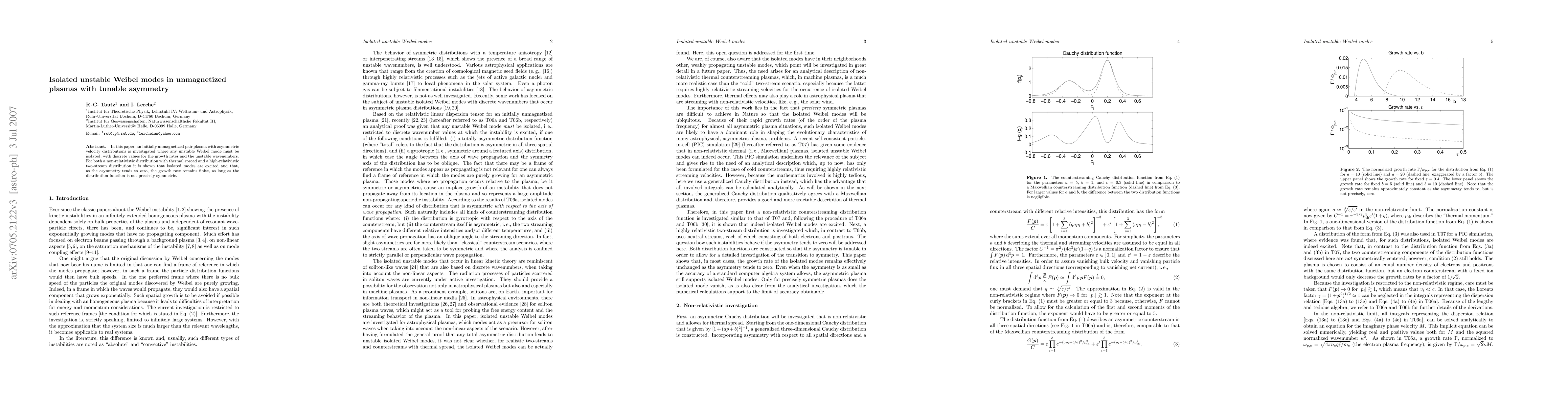 Researchers investigate isolated unstable Weibel modes in unmagnetized plasmas with tunable asymmetry, finding that growth rates remain finite as asymmetry approaches zero.
