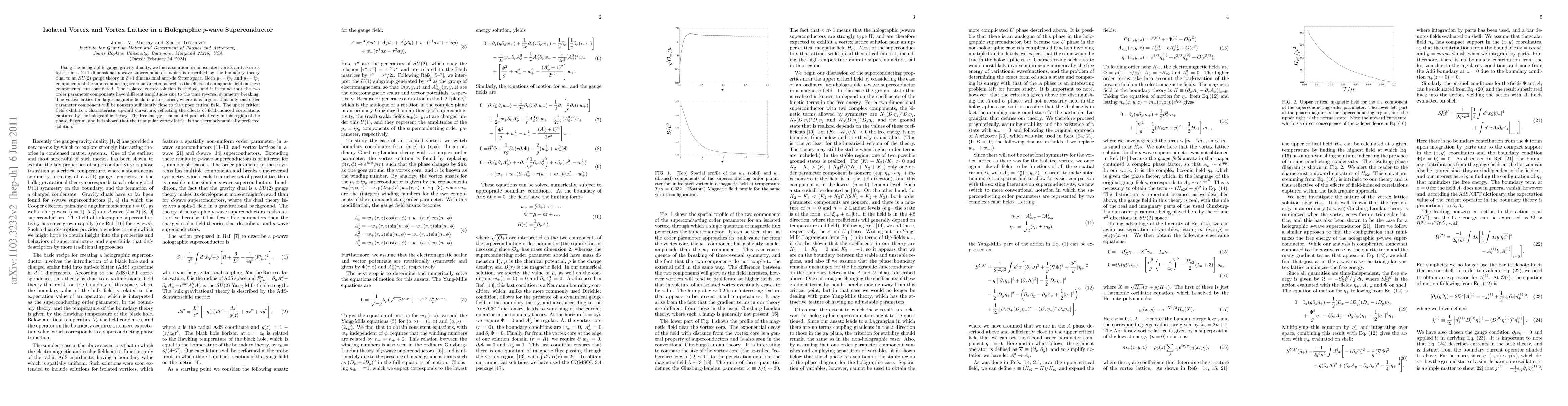 This paper employs holographic duality to explore isolated vortices and vortex lattices in a 2+1 dimensional p-wave superconductor, revealing distinct amplitudes for the superconducting order parameter components and the thermodynamic preference for a triangular vortex lattice under strong magnetic fields.