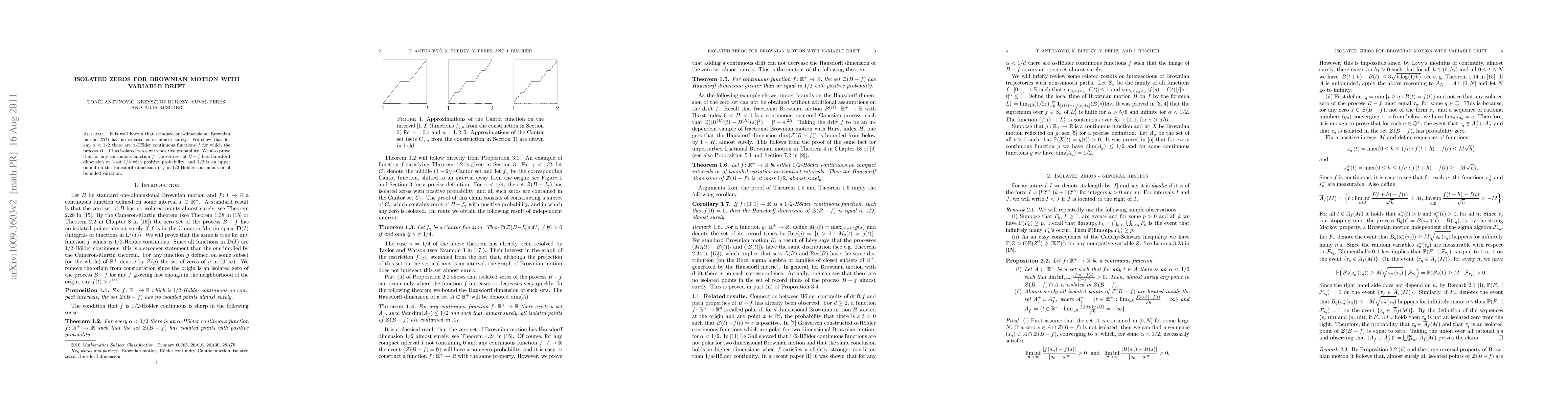 The paper demonstrates that for one-dimensional Brownian motion with variable drift, isolated zeros can occur with positive probability when the drift function is alpha-Holder continuous for any alpha<1/2. It also establishes that the Hausdorff dimension of the zero set for any continuous drift function is at least 1/2 with positive probability, with 1/2 serving as an upper bound if the drift function is 1/2-Holder continuous or of bounded variation.