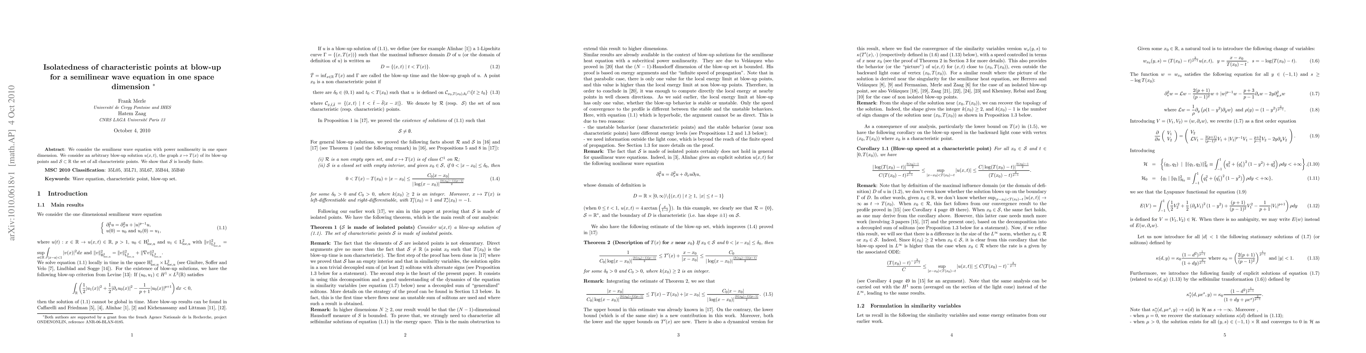 Summary: This paper examines the semilinear wave equation with power nonlinearity in one dimension, demonstrating that the set of characteristic points where blow-up occurs is locally finite, implying isolatedness of these points.
