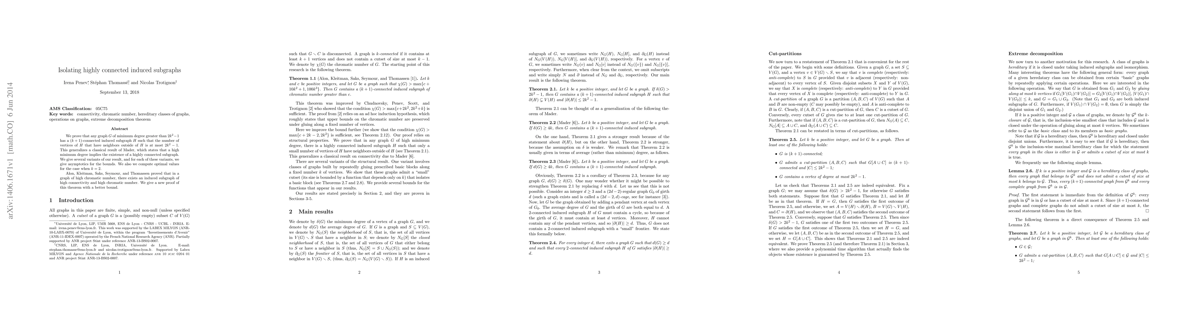 We prove that any graph $G$ of minimum degree greater than $2k^2-1$ has a $(k+1)$-connected induced subgraph $H$ such that the number of vertices of $H$ that have neighbors outside of $H$ is at most $2k^2-1$. This generalizes a classical result of Mader, which states that a high minimum degree implies the existence of a highly connected subgraph. We give several variants of our result, and for each of these variants, we give asymptotics for the bounds. We also we compute optimal values for the case when $k=2$. Alon, Kleitman, Saks, Seymour, and Thomassen proved that in a graph of high chromatic number, there exists an induced subgraph of high connectivity and high chromatic number. We give a new proof of this theorem with a better bound.