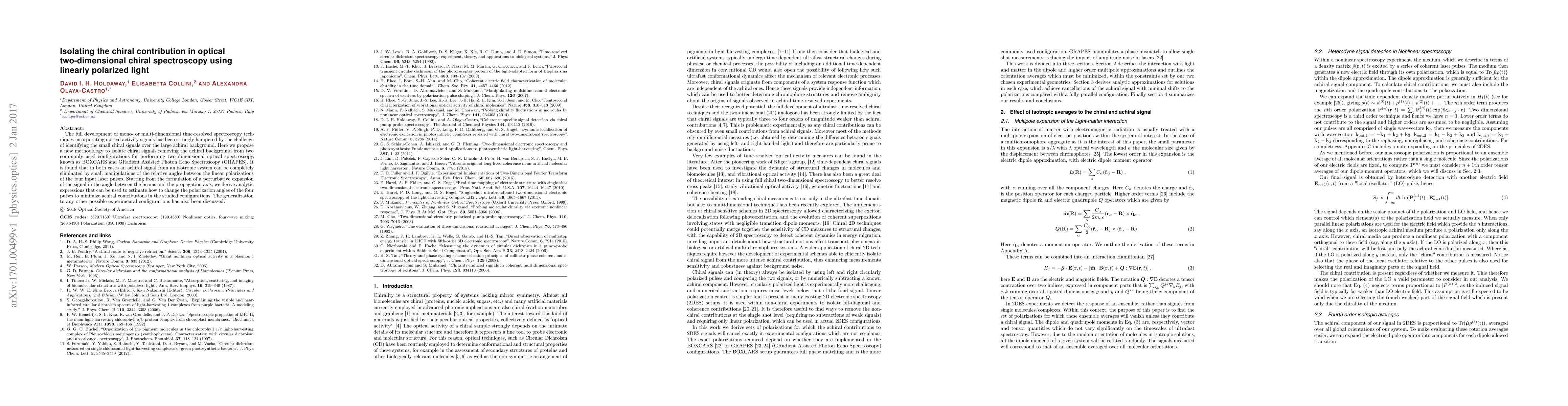 The full development of mono- or multi-dimensional time-resolved spectroscopy techniques incorporating optical activity signals has been strongly hampered by the challenge of identifying the small chiral signals over the large achiral background. Here we propose a new methodology to isolate chiral signals removing the achiral background from two commonly used configurations for performing two dimensional optical spectroscopy, known as BOXCARS and GRadient Assisted Photon Echo Spectroscopy (GRAPES). It is found that in both cases an achiral signal from an isotropic system can be completely eliminated by small manipulations of the relative angles between the linear polarizations of the four input laser pulses. Starting from the formulation of a perturbative expansion of the signal in the angle between the beams and the propagation axis, we derive analytic expressions that can be used to estimate how to change the polarization angles of the four pulses to minimize achiral contributions in the studied configurations. The generalization to any other possible experimental configurations has also been discussed. %We derive analytic expressions to changes required to the polarizations in terms of a perturbative expansion in the angle between the beams and the colinear axis. We also numerically estimate higher order coefficients which cover arbitrarily large angles and thus any experimental configuration.