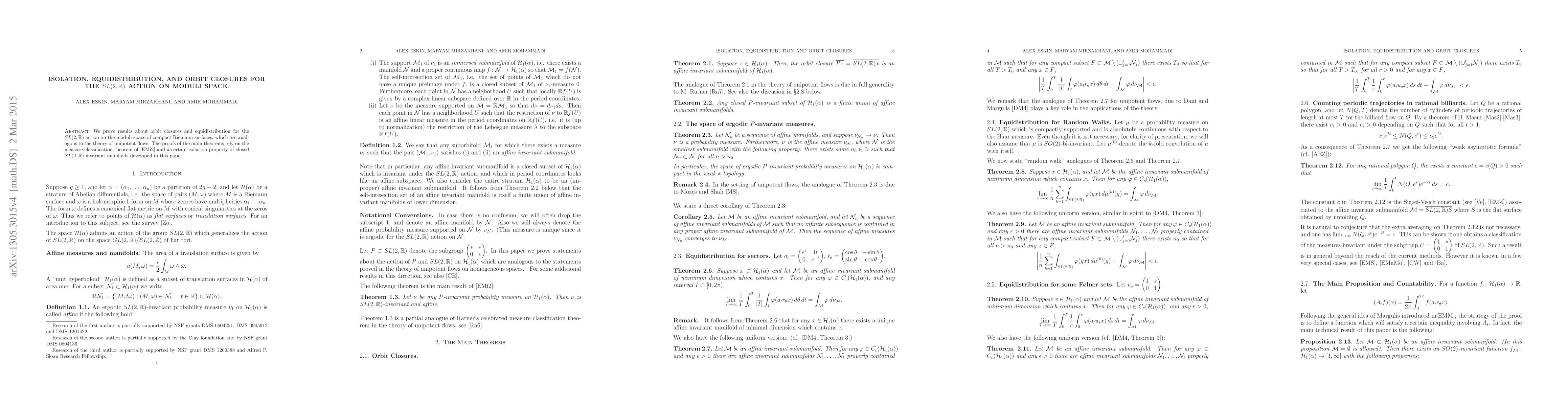 This paper proves theorems on orbit closures and equidistribution for the SL(2,R) action on moduli space, analogous to unipotent flow theory, using the measure classification theorem and a newly developed isolation property of invariant manifolds.