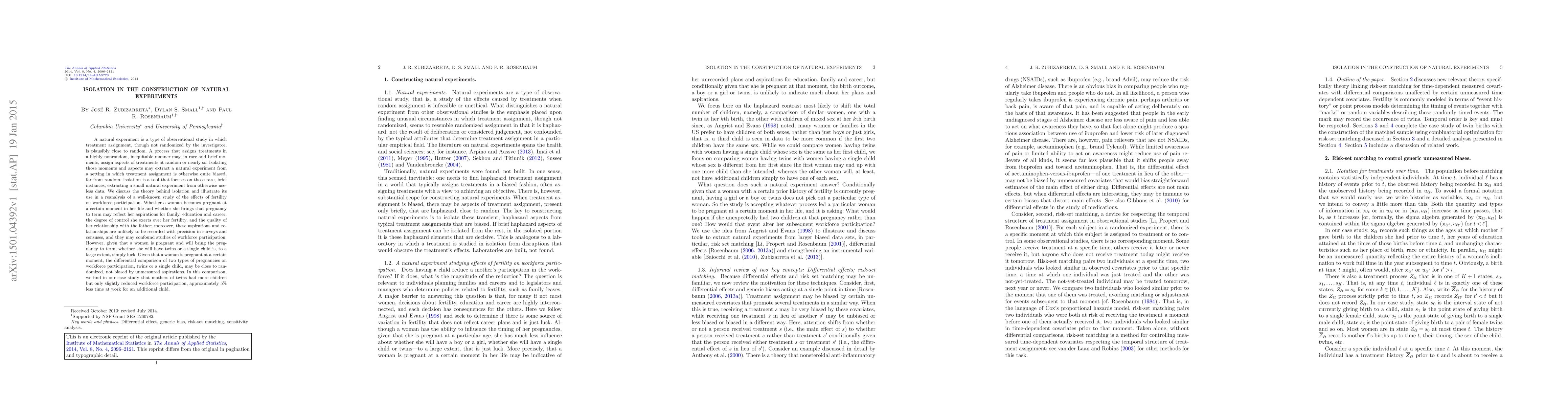 A natural experiment is a type of observational study in which treatment assignment, though not randomized by the investigator, is plausibly close to random. A process that assigns treatments in a highly nonrandom, inequitable manner may, in rare and brief moments, assign aspects of treatments at random or nearly so. Isolating those moments and aspects may extract a natural experiment from a setting in which treatment assignment is otherwise quite biased, far from random. Isolation is a tool that focuses on those rare, brief instances, extracting a small natural experiment from otherwise useless data. We discuss the theory behind isolation and illustrate its use in a reanalysis of a well-known study of the effects of fertility on workforce participation. Whether a woman becomes pregnant at a certain moment in her life and whether she brings that pregnancy to term may reflect her aspirations for family, education and career, the degree of control she exerts over her fertility, and the quality of her relationship with the father; moreover, these aspirations and relationships are unlikely to be recorded with precision in surveys and censuses, and they may confound studies of workforce participation. However, given that a women is pregnant and will bring the pregnancy to term, whether she will have twins or a single child is, to a large extent, simply luck. Given that a woman is pregnant at a certain moment, the differential comparison of two types of pregnancies on workforce participation, twins or a single child, may be close to randomized, not biased by unmeasured aspirations. In this comparison, we find in our case study that mothers of twins had more children but only slightly reduced workforce participation, approximately 5% less time at work for an additional child.
