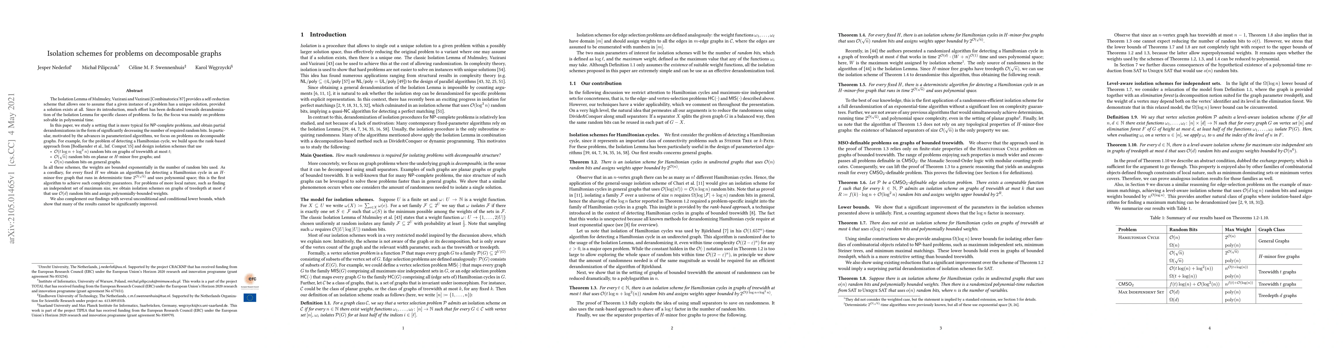 The Isolation Lemma of Mulmuley, Vazirani and Vazirani [Combinatorica'87] provides a self-reduction scheme that allows one to assume that a given instance of a problem has a unique solution, provided a solution exists at all. Since its introduction, much effort has been dedicated towards derandomization of the Isolation Lemma for specific classes of problems. So far, the focus was mainly on problems solvable in polynomial time. In this paper, we study a setting that is more typical for $\mathsf{NP}$-complete problems, and obtain partial derandomizations in the form of significantly decreasing the number of required random bits. In particular, motivated by the advances in parameterized algorithms, we focus on problems on decomposable graphs. For example, for the problem of detecting a Hamiltonian cycle, we build upon the rank-based approach from [Bodlaender et al., Inf. Comput.'15] and design isolation schemes that use - $O(t\log n + \log^2{n})$ random bits on graphs of treewidth at most $t$; - $O(\sqrt{n})$ random bits on planar or $H$-minor free graphs; and - $O(n)$-random bits on general graphs. In all these schemes, the weights are bounded exponentially in the number of random bits used. As a corollary, for every fixed $H$ we obtain an algorithm for detecting a Hamiltonian cycle in an $H$-minor-free graph that runs in deterministic time $2^{O(\sqrt{n})}$ and uses polynomial space; this is the first algorithm to achieve such complexity guarantees. For problems of more local nature, such as finding an independent set of maximum size, we obtain isolation schemes on graphs of treedepth at most $d$ that use $O(d)$ random bits and assign polynomially-bounded weights. We also complement our findings with several unconditional and conditional lower bounds, which show that many of the results cannot be significantly improved.