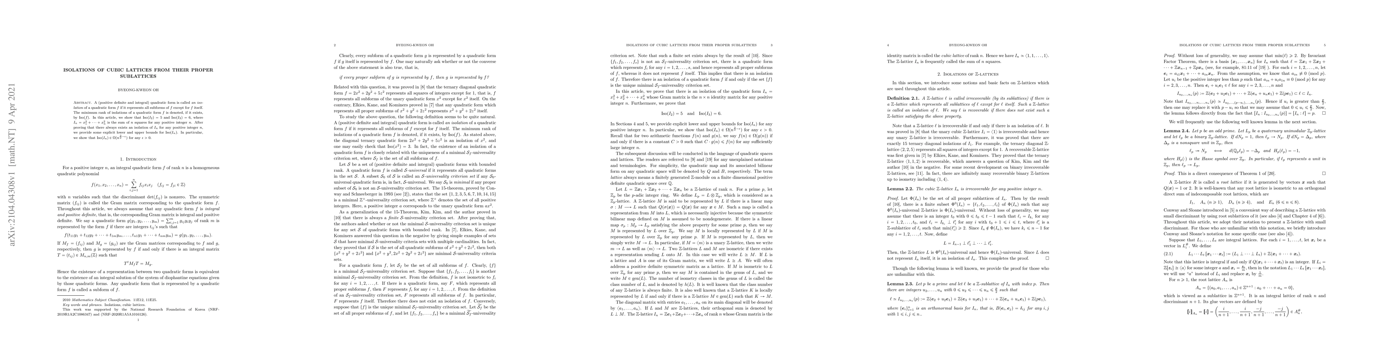 Researchers found that isolations of cubic lattices have a minimum rank of 5 for $I_2$ and 6 for $I_3$, with lower and upper bounds for the general case of $I_n$.
