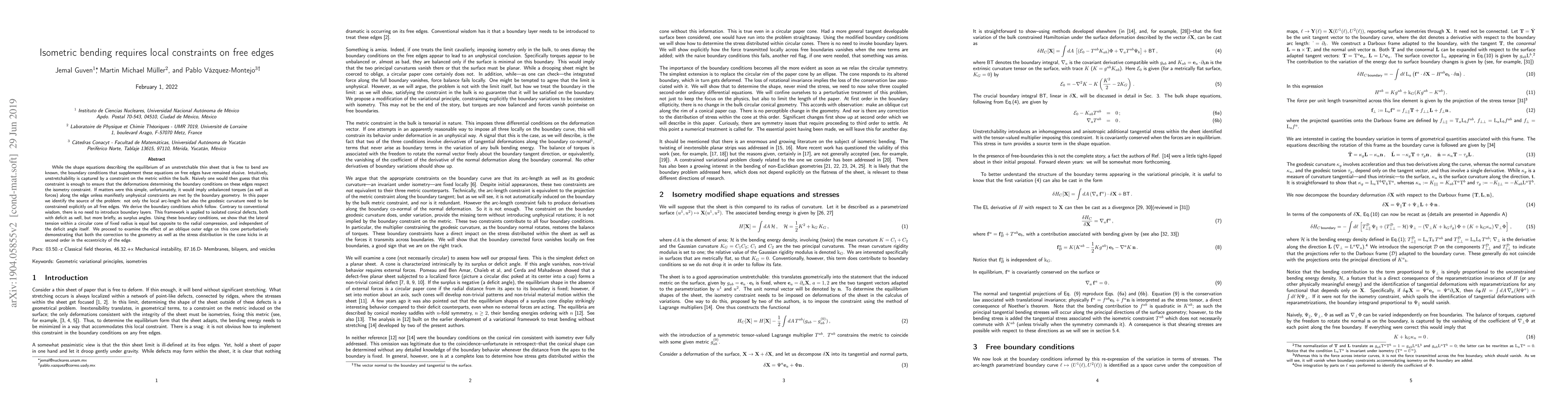 While the shape equations describing the equilibrium of an unstretchable thin sheet that is free to bend are known, the boundary conditions that supplement these equations on free edges have remained elusive. Intuitively, unstretchability is captured by a constraint on the metric within the bulk. Naively one would then guess that this constraint is enough to ensure that the deformations determining the boundary conditions on these edges respect the isometry constraint. If matters were this simple, unfortunately, it would imply unbalanced torques (as well as forces) along the edge unless manifestly unphysical constraints are met by the boundary geometry. In this paper we identify the source of the problem: not only the local arc-length but also the geodesic curvature need to be constrained explicitly on all free edges. We derive the boundary conditions which follow. Contrary to conventional wisdom, there is no need to introduce boundary layers. This framework is applied to isolated conical defects, both with deficit as well, but more briefly, as surplus angles. Using these boundary conditions, we show that the lateral tension within a circular cone of fixed radius is equal but opposite to the radial compression, and independent of the deficit angle itself. We proceed to examine the effect of an oblique outer edge on this cone perturbatively demonstrating that both the correction to the geometry as well as the stress distribution in the cone kicks in at second order in the eccentricity of the edge.