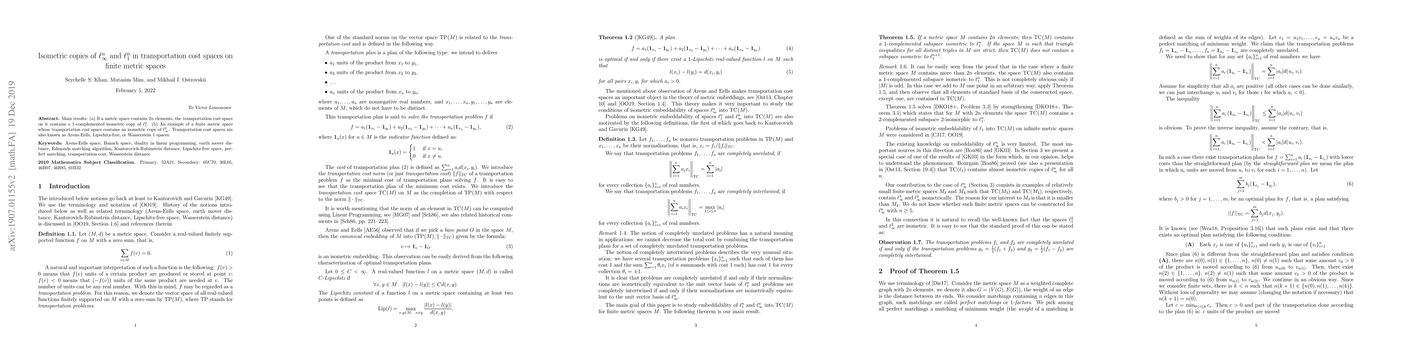 Summary: This paper proves the existence of $1$-complemented isometric copies of $\ell_1^n$ in transportation cost spaces of $2n$-element metric spaces and provides an example of a finite metric space housing an isometric copy of $\ell_\infty^4$ in its transportation cost space.