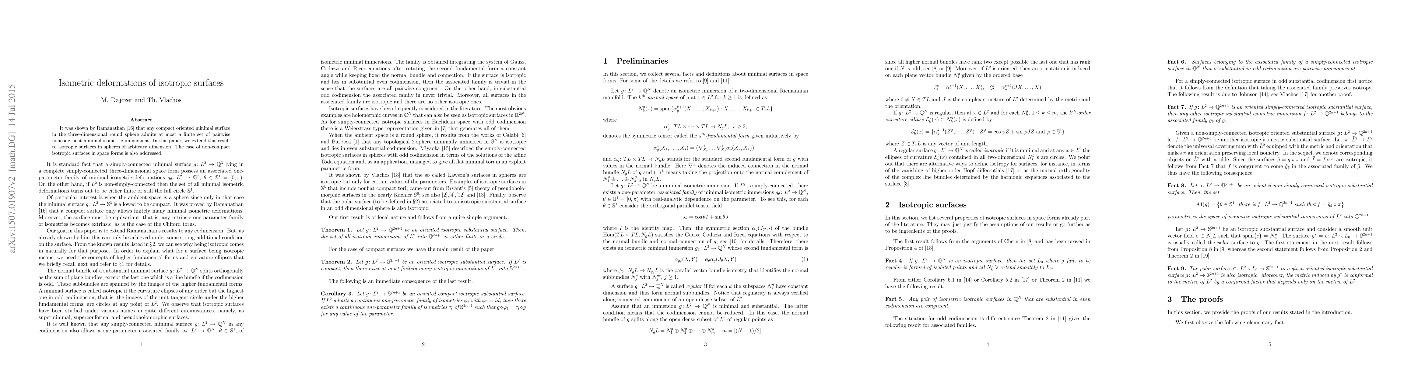This paper extends Ramanathan's result on minimal surfaces to isotropic surfaces in spheres of any dimension, showing they admit a finite set of noncongruent minimal isometric immersions. It also investigates non-compact isotropic surfaces in space forms.
