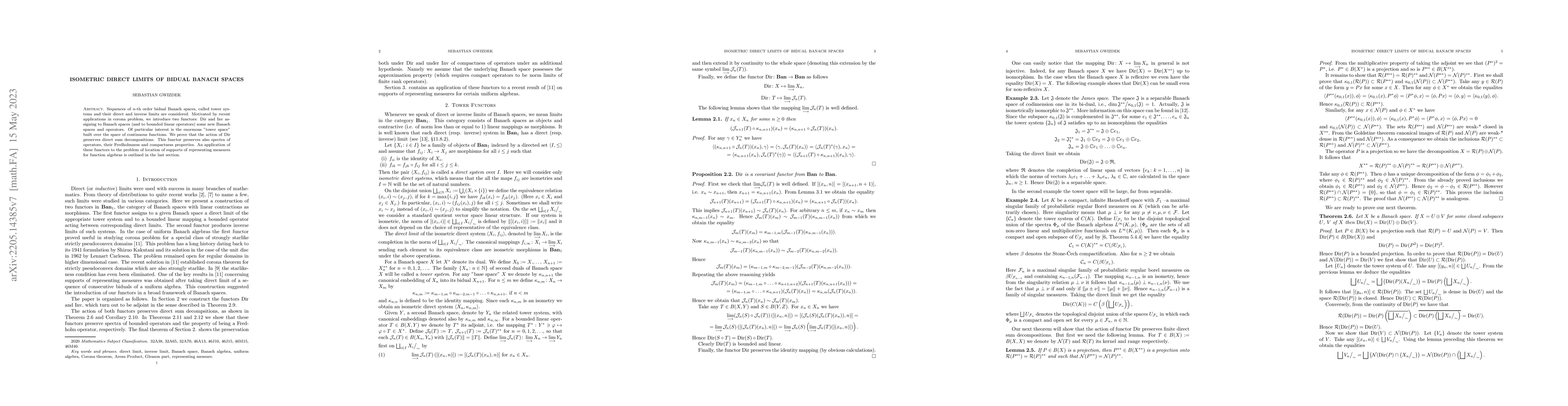 This paper introduces new functors, $\textrm{Dir}$ and $\textrm{Inv}$, for constructing direct and inverse limits of tower systems of bidual Banach spaces, with applications to uniform algebras. It shows that $\textrm{Dir}$ preserves direct sum decompositions, spectra, Fredholmness, and compactness properties, and outlines their application to locating supports of representing measures for function algebras.