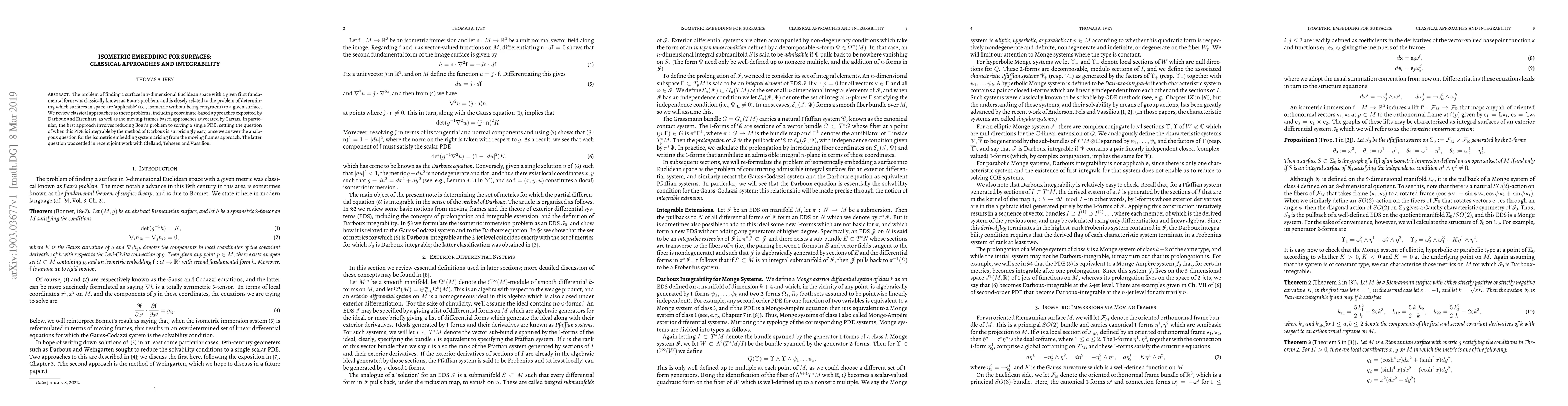 This paper reviews classical methods for isometrically embedding Riemannian surfaces into 3D Euclidean space, focusing on coordinate-based and moving frames approaches. It highlights the integrability of the PDE involved in the coordinate-based method, which parallels recent findings on the moving frames approach.