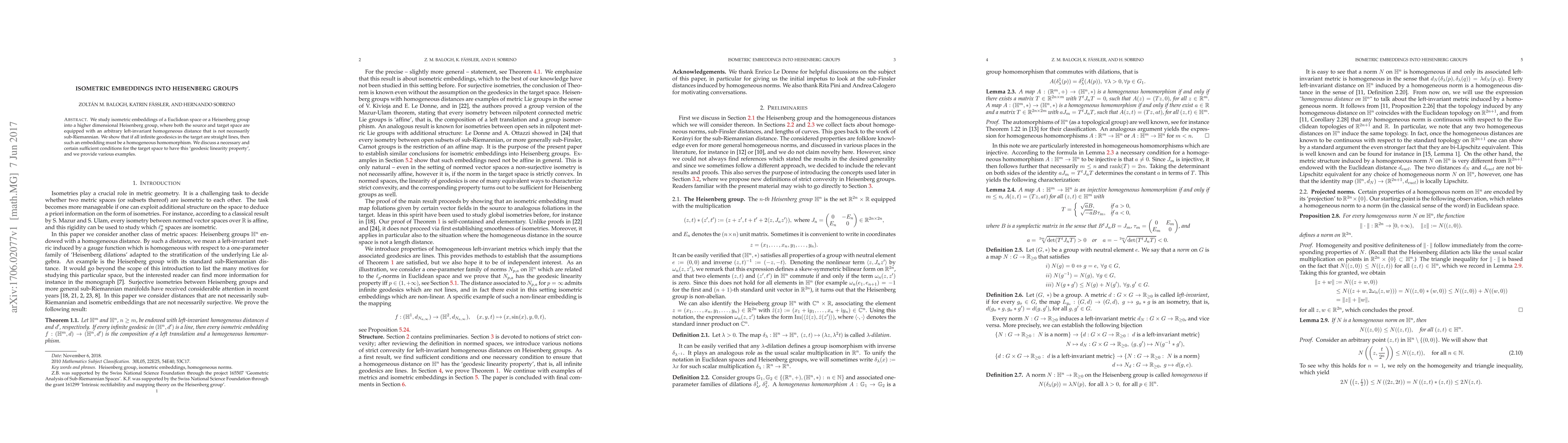 We study isometric embeddings of a Euclidean space or a Heisenberg group into a higher dimensional Heisenberg group, where both the source and target space are equipped with an arbitrary left-invariant homogeneous distance that is not necessarily sub-Riemannian. We show that if all infinite geodesics in the target are straight lines, then such an embedding must be a homogeneous homomorphism. We discuss a necessary and certain sufficient conditions for the target space to have this `geodesic linearity property', and we provide various examples.