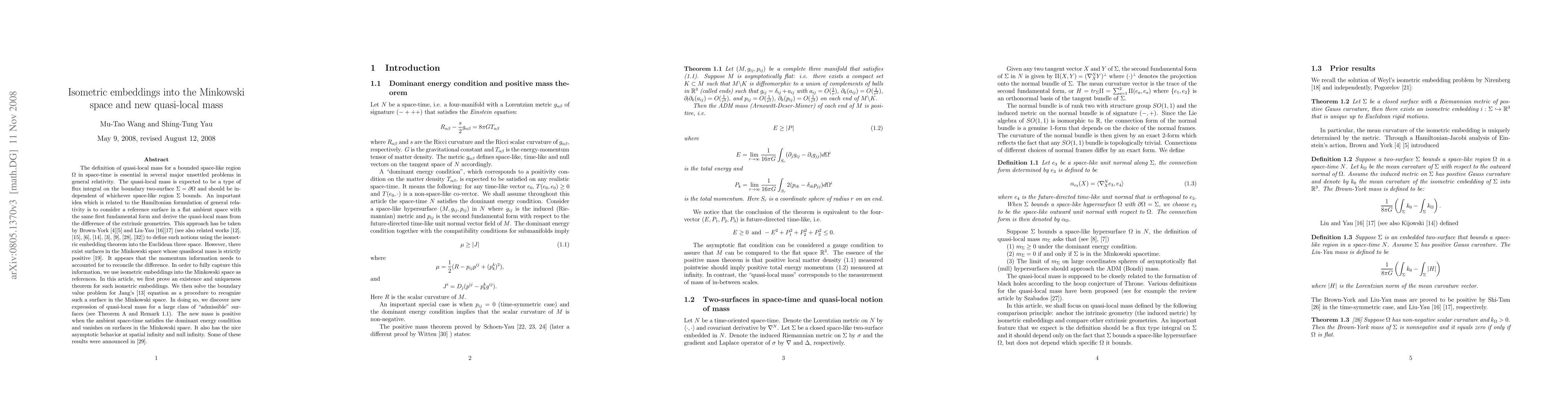 This paper explores the definition of quasi-local mass in space-time by employing isometric embeddings into Minkowski space, proving an existence and uniqueness theorem for these embeddings. It introduces a new quasi-local mass expression that is positive under the dominant energy condition and vanishes on Minkowski surfaces, with favorable asymptotic behavior.