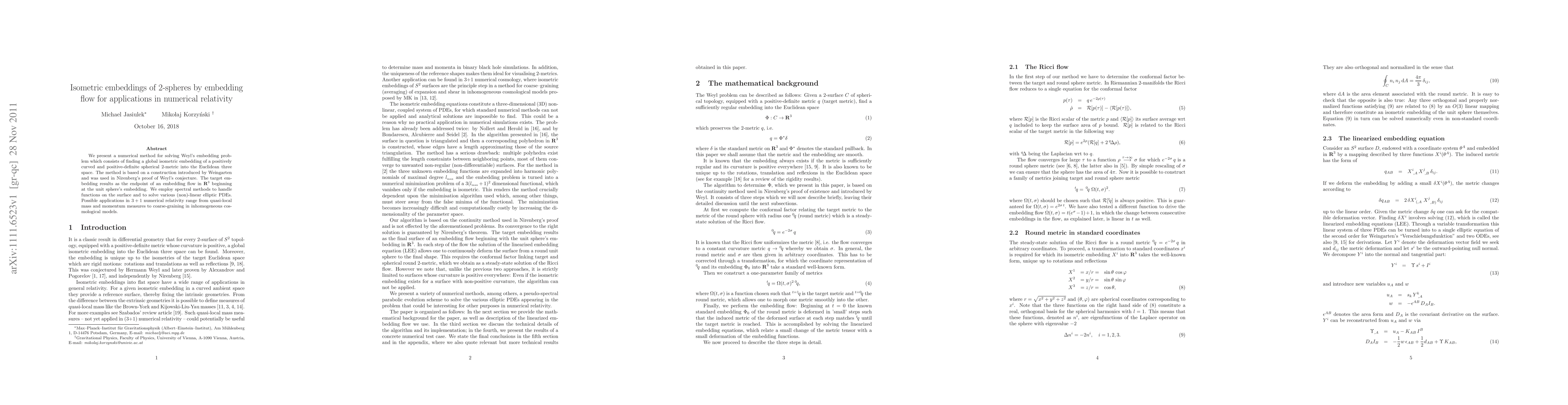 This paper introduces a numerical method for solving Weyl's embedding problem using an embedding flow, achieving global isometric embeddings of 2-spheres in Euclidean three-space. The method employs spectral techniques to solve associated PDEs and has potential applications in numerical relativity, including quasi-local mass and momentum measures.